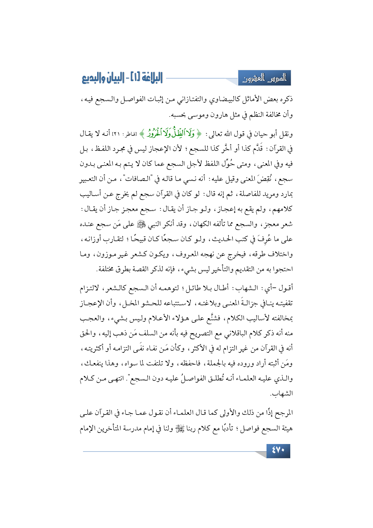 ونقل أبو حيان في قول الله تعالى: {وَلَا الظِّلُّ وَلَا الْحَرُورُ} (فاطر: 21) أنه لا يقال في القرآن: قَدَّم كذا أو أخَّر كذا للسجع؛ لأن الإعجاز ليس في مجرد اللفظ، بل فيه وفي المعنى، ومتى حُوِّل اللفظ لأجل السجع عما كان لا يتم به المعنى بدون سجع، نُقِضَ المعنى وقيل عليه: أنه نسي ما قاله في "الصافات"، من أن التعبير بمارد ومريد للفاصلة، ثم إنه قال: لو كان في القرآن سجع لم يخرج عن أساليب كلامهم، ولم يقع به إعجاز، ولو جاز أن يقال: سجع معجز جاز أن يقال: شعر معجز، والسجع مما تألفه الكهان، وقد أنكر النبي -صلى الله عليه وسلم- على مَن سجع عنده على ما عُرِفَ في كتب الحديث، ولو كان سجعًا كان قبيحًا؛ لتقارب أوزانه، واختلاف طرقه، فيخرج عن نهجه المعروف، ويكون كشعر غير موزون، وما احتجوا به من التقديم والتأخير ليس بشيء، فإنه لذكر القصة بطرق مختلفة.