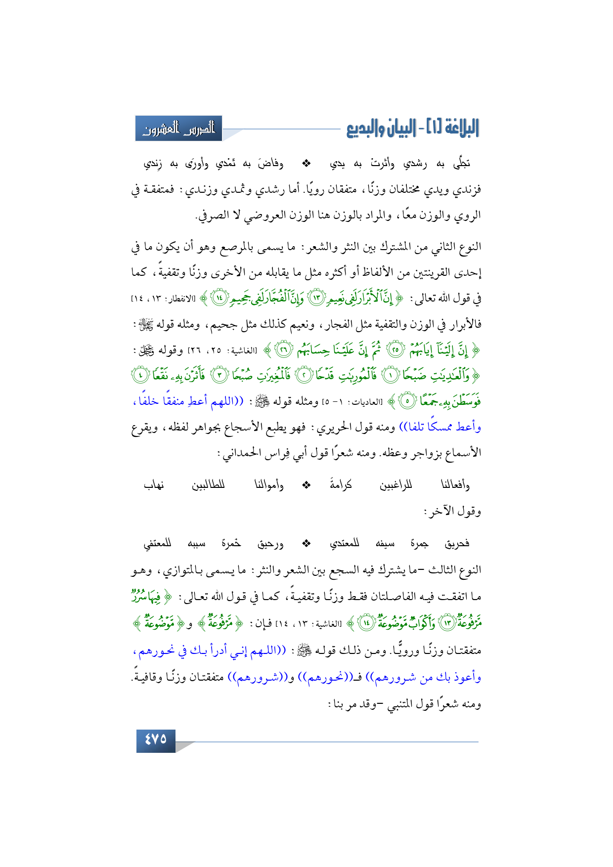 النوع الثاني من المشترك بين النثر والشعر: ما يسمى بالمرصع وهو أن يكون ما في إحدى القرينتين من الألفاظ أو أكثره مثل ما يقابله من الأخرى وزنًا وتقفيةً، كما في قول الله تعالى: {إِنَّ الْأَبْرَارَ لَفِي نَعِيمٍ * وَإِنَّ الْفُجَّارَ لَفِي جَحِيمٍ} (الانفطار: 13، 14) فالأبرار في الوزن والتقفية مثل الفجار، ونعيم كذلك مثل جحيم، ومثله قوله -سبحانه وتعالى: {إِنَّ إِلَيْنَا إِيَابَهُمْ * ثُمَّ إِنَّ عَلَيْنَا حِسَابَهُمْ} (الغاشية: 25، 26) وقوله -عز وجل: {وَالْعَادِيَاتِ ضَبْحًا * فَالْمُورِيَاتِ قَدْحًا * فَالْمُغِيرَاتِ صُبْحًا * فَأَثَرْنَ بِهِ نَقْعًا * فَوَسَطْنَ بِهِ جَمْعًا} (العاديات: 1 - 5) ومثله قوله -صلى الله عليه وسلم: ((اللهم أعطِ منفقًا خلفًا، وأعط ممسكًا تلفا)) ومنه قول الحريري: فهو يطبع الأسجاع بجواهر لفظه، ويقرع الأسماع بزواجر وعظه. ومنه شعرًا قول أبي فِراس الحمداني: