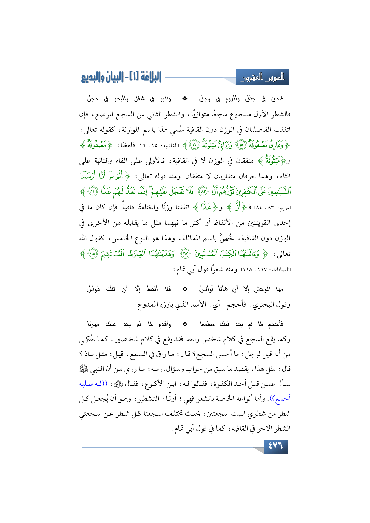 فالشطر الأول مسجوع سجعًا متوازيًا، والشطر الثاني من السجع المرصع، فإن اتفقت الفاصلتان في الوزن دون القافية سُمي هذا باسم الموازنة، كقوله تعالى: {وَنَمَارِقُ مَصْفُوفَةٌ * وَزَرَابِيُّ مَبْثُوثَةٌ} (الغاشية: 15، 16) فلفظا: {مَصْفُوفَةٌ} و {مَبْثُوثَةٌ} متفقان في الوزن لا في القافية، فالأولى على الفاء والثانية على الثاء، وهما حرفان متقاربان لا متفقان. ومنه قوله تعالى: {أَلَمْ تَرَ أَنَّا أَرْسَلْنَا الشَّيَاطِينَ عَلَى الْكَافِرِينَ تَؤُزُّهُمْ أَزًّا * فَلَا تَعْجَلْ عَلَيْهِمْ إِنَّمَا نَعُدُّ لَهُمْ عَدًّا} (مريم: 83، 84) فـ {أَزًّا} و {عَدًّا} اتفقتا وزنًا واختلفتَا قافيةً. فإن كان ما في إحدى القرينتين من الألفاظ أو أكثر ما فيهما مثل ما يقابله من الأخرى في الوزن دون القافية، خُصَّ باسم المماثلة، وهذا هو النوع الخامس، كقول الله تعالى: {وَآتَيْنَاهُمَا الْكِتَابَ الْمُسْتَبِينَ * وَهَدَيْنَاهُمَا الصِّرَاطَ الْمُسْتَقِيمَ} (الصافات: 117، 118). ومنه شعرًا قول أبي تمام: