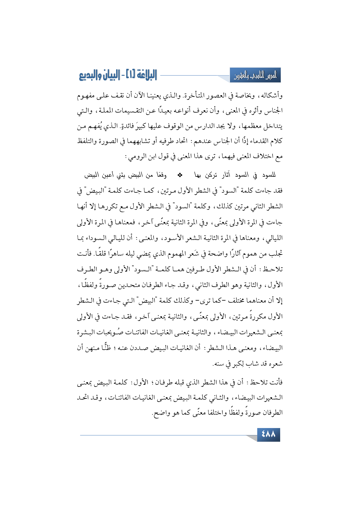 فأنت تلاحظ: أن في هذا الشطر الذي قبله طرفان؛ الأول: كلمة البيض بمعنى الشعيرات البيضاء، والثاني كلمة البيض بمعنى الغانيات الفاتنات، وقد اتحد الطرفان صورةً ولفظًا واختلفا معنًى كما هو واضح.