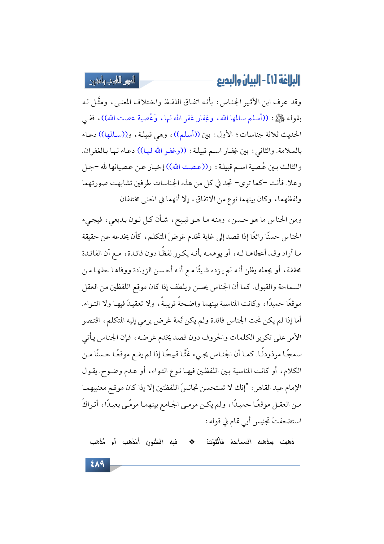 وقد عرف ابن الأثير الجناس: بأنه اتفاق اللفظ واختلاف المعنى، ومثَّل له بقوله -صلى الله عليه وسلم: ((أسلم سالمها الله، وغِفار غفر الله لها، وَعُصية عصت الله))، ففي الحديث ثلاثة جناسات؛ الأول: بين ((أسلم))، وهي قبيلة، و ((سالمها)) دعاء بالسلامة. والثاني: بين غِفار اسم قبيلة: ((وغفر الله لها)) دعاء لها بالغفران. والثالث بين عُصية اسم قبيلة: و ((عصت الله)) إخبار عن عصيانها لله -جل وعلا. فأنت -كما ترى- تجد في كل من هذه الجناسات طرفين تشابهت صورتهما ولفظهما، وكان بينهما نوع من الاتفاق، إلا أنهما في المعنى مختلفان.