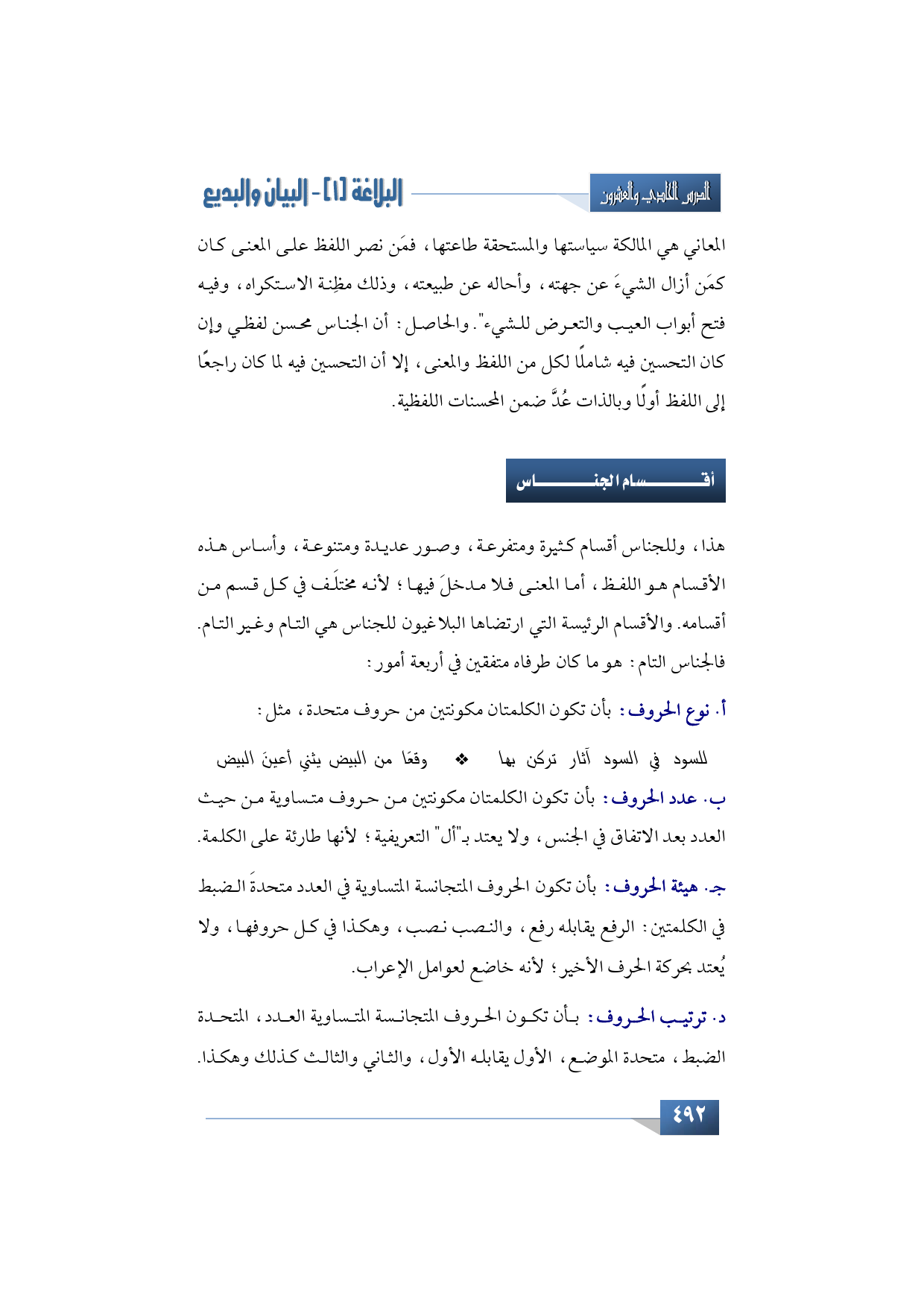 المعاني هي المالكة سياستها والمستحقة طاعتها، فمَن نصر اللفظ على المعنى كان كمَن أزال الشيءَ عن جهته، وأحاله عن طبيعته، وذلك مظِنة الاستكراه، وفيه فتح أبواب العيب والتعرض للشيء". والحاصل: أن الجناس محسن لفظي وإن كان التحسين فيه شاملًا لكل من اللفظ والمعنى، إلا أن التحسين فيه لما كان راجعًا إلى اللفظ أولًا وبالذات عُدَّ ضمن المحسنات اللفظية.