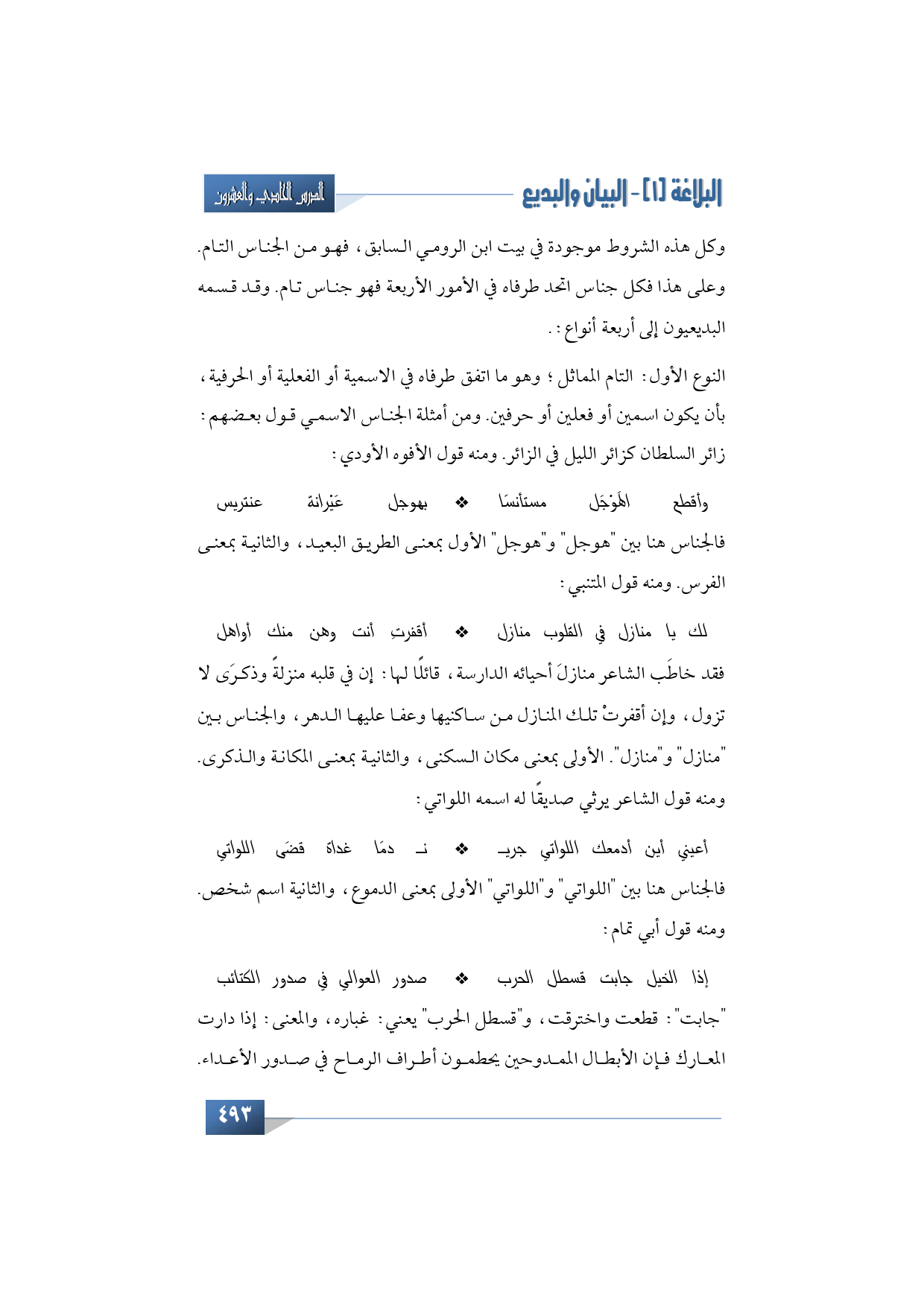 وكل هذه الشروط موجودة في بيت ابن الرومي السابق، فهو من الجناس التام. وعلى هذا فكل جناس اتحد طرفاه في الأمور الأربعة فهو جناس تام. وقد قسمه البديعيون إلى أربعة أنواع: