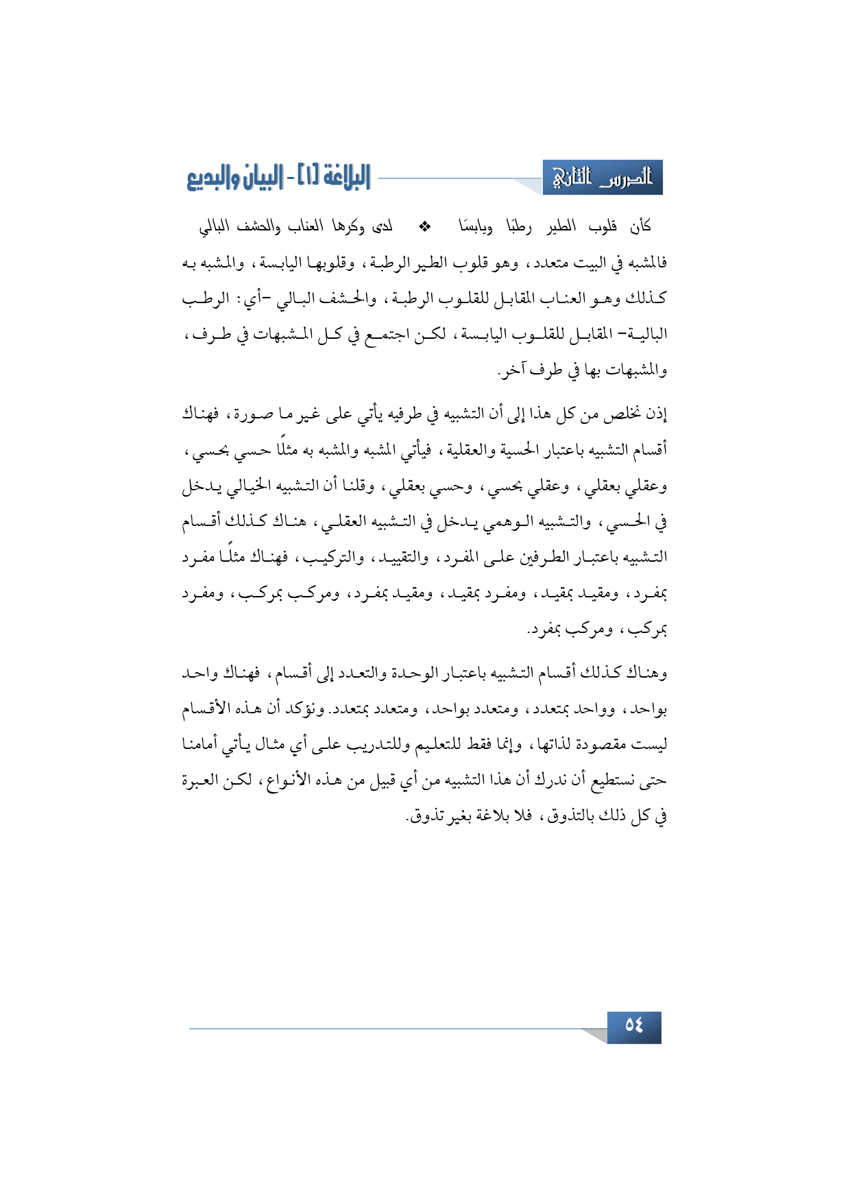 إذن نخلص من كل هذا إلى أن التشبيه في طرفيه يأتي على غير ما صورة، فهناك أقسام التشبيه باعتبار الحسية والعقلية، فيأتي المشبه والمشبه به مثلًا حسي بحسي، وعقلي بعقلي، وعقلي بحسي، وحسي بعقلي، وقلنا أن التشبيه الخيالي يدخل في الحسي، والتشبيه الوهمي يدخل في التشبيه العقلي، هناك كذلك أقسام التشبيه باعتبار الطرفين على المفرد، والتقييد، والتركيب، فهناك مثلًا مفرد بمفرد، ومقيد بمقيد، ومفرد بمقيد، ومقيد بمفرد، ومركب بمركب، ومفرد بمركب، ومركب، بمفرد.