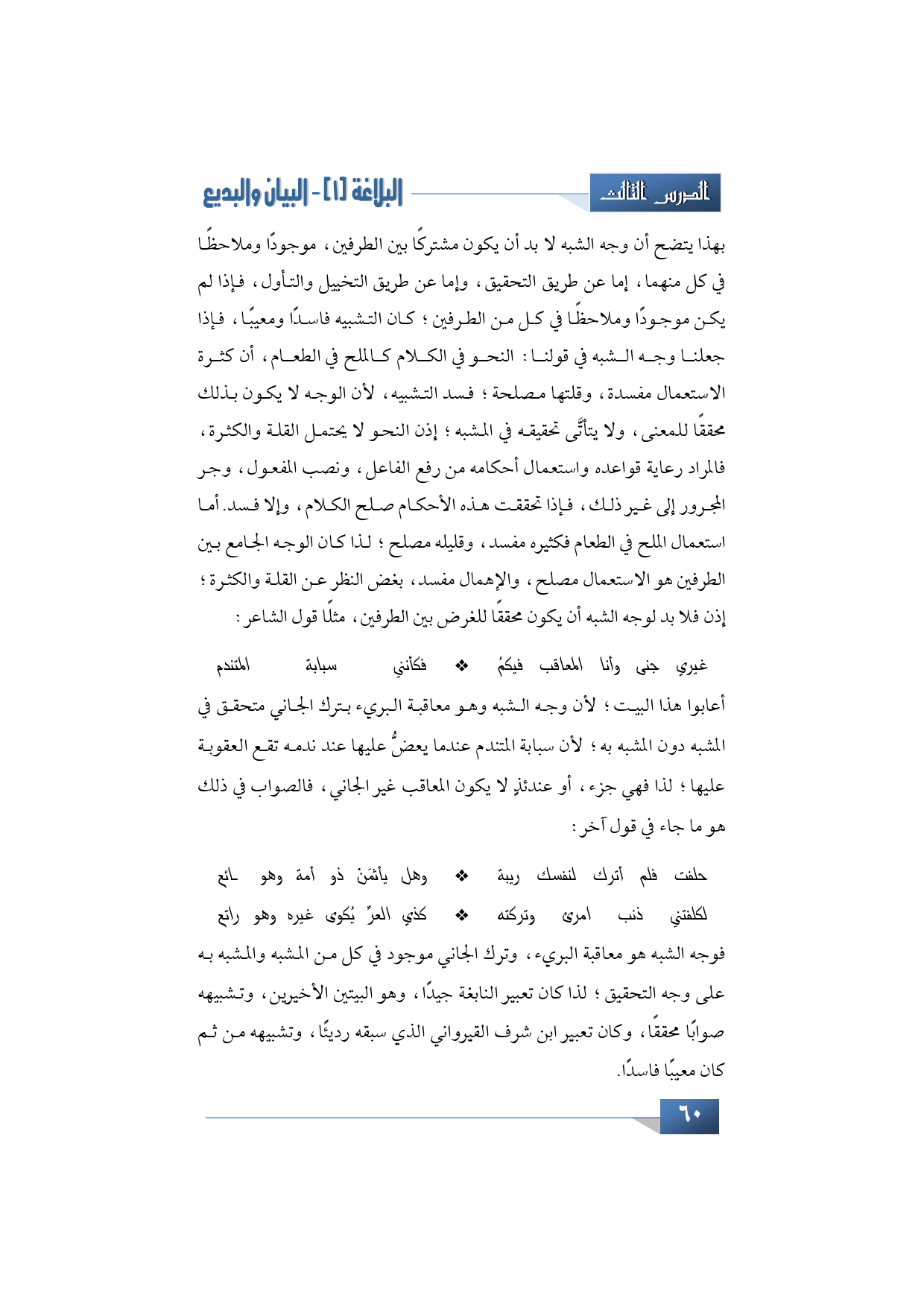 بهذا يتضح أن وجه الشبه لا بد أن يكون مشتركًا بين الطرفين، موجودًا وملاحظًا في كل منهما، إما عن طريق التحقيق، وإما عن طريق التخييل والتأول، فإذا لم يكن موجودًا وملاحظًا في كل من الطرفين؛ كان التشبيه فاسدًا ومعيبًا، فإذا جعلنا وجه الشبه في قولنا: النحو في الكلام كالملح في الطعام، أن كثرة الاستعمال مفسدة، وقلتها مصلحة؛ فسد التشبيه، لأن الوجه لا يكون بذلك محققًا للمعنى، ولا يتأتَّى تحقيقه في المشبه؛ إذن النحو لا يحتمل القلة والكثرة، فالمراد رعاية قواعده واستعمال أحكامه من رفع الفاعل، ونصب المفعول، وجر المجرور إلى غير ذلك، فإذا تحققت هذه الأحكام صلح الكلام، وإلا فسد. أما استعمال الملح في الطعام فكثيره مفسد، وقليله مصلح؛ لذا كان الوجه الجامع بين الطرفين هو الاستعمال مصلح، والإهمال مفسد، بغض النظر عن القلة والكثرة؛ إذن فلا بد لوجه الشبه أن يكون محققًا للغرض بين الطرفين، مثلًا قول الشاعر: