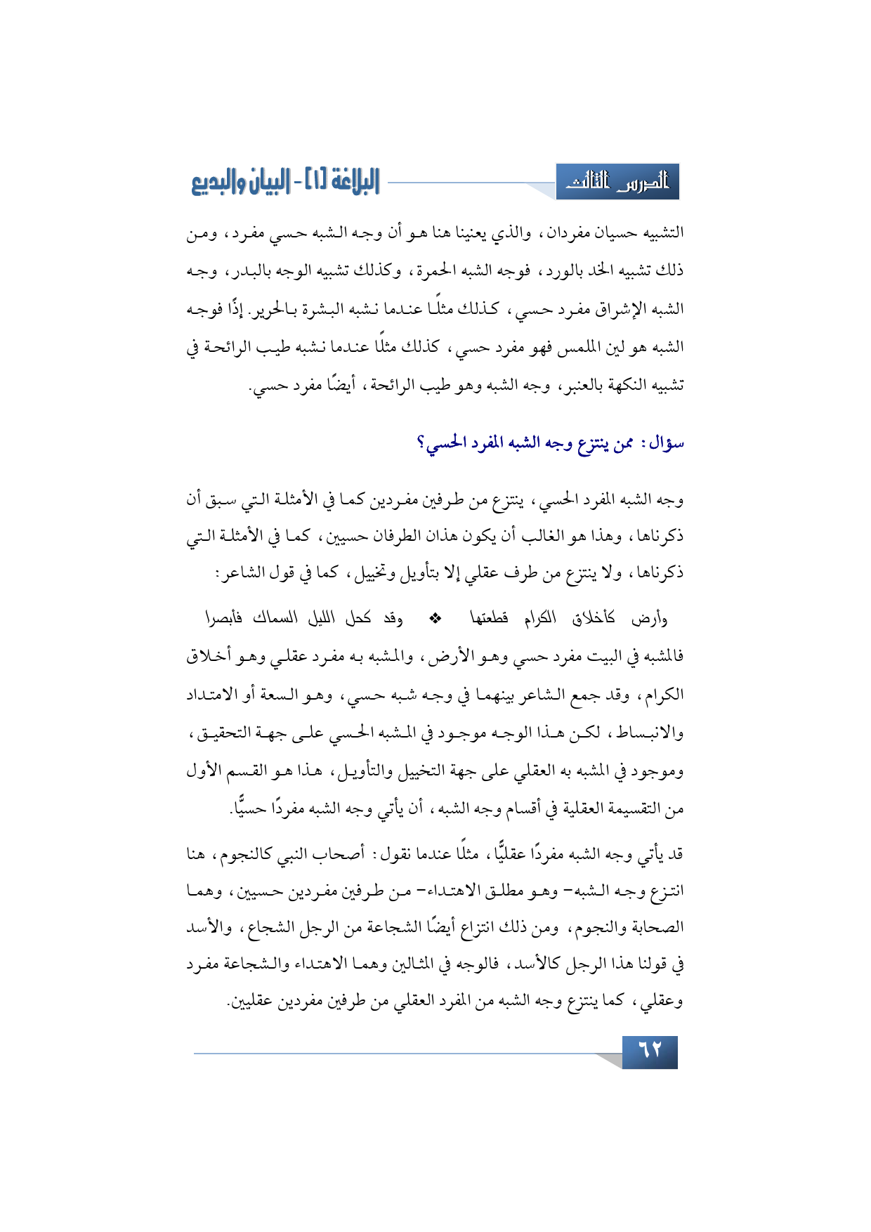 التشبيه حسيان مفردان، الذي يعنينا هنا هو وجه الشبه، حسي مفرد، من ذلك مثلًا التشبيه الخد بالورد، الوجه الشبه الحمرة، واحد مفرد، وحسي كذلك تشبيه الوجه بالبدر، وجه الشبه الإشراق مفرد حسي، كذلك مثلًا عندما نشبه البشرة بالحرير.