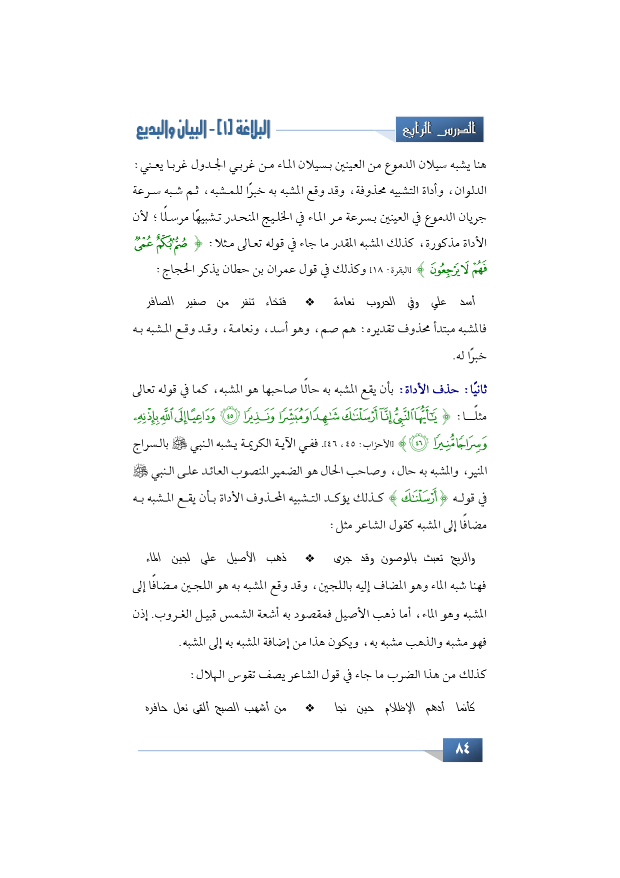 هنا يشبه سيلان الدموع من العينين بسيلان الماء من غربي الجدول غربا يعني: الدلوان، وأداة التشبيه محذوفة، وقد وقع المشبه به خبرًا للمشبه، ثم شبه سرعة جريان الدموع في العينين بسرعة مر الماء في الخليج المنحدر تشبيهًا مرسلًا؛ لأن الأداة مذكورة، كذلك المشبه المقدر ما جاء في قوله تعالى مثلا: {صُمٌّ بُكْمٌ عُمْيٌ فَهُمْ لَا يَرْجِعُونَ} (البقرة: 18) وكذلك في قول عمران بن حطان يذكر الحجاج: