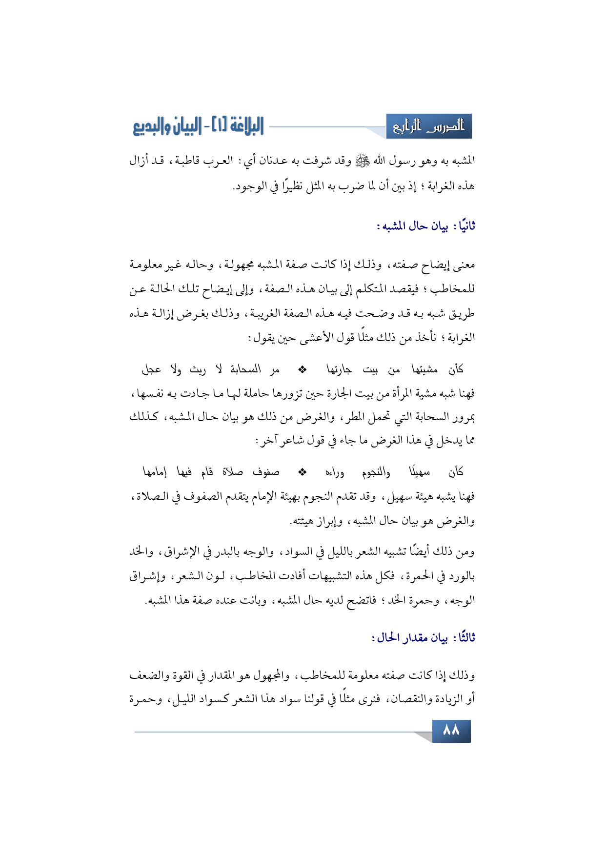 الأمر الثالث، أو الغرض الثالث الذي يعود على المشبه: بيان مقدار الحال، وذلك إذا كانت صفته معلومة للمخاطب، والمجهول هو المقدار في القوة والضعف أو الزيادة والنقصان، فنرى مثلًا في قولنا سواد هذا الشعر كسواد الليل، وحمرة