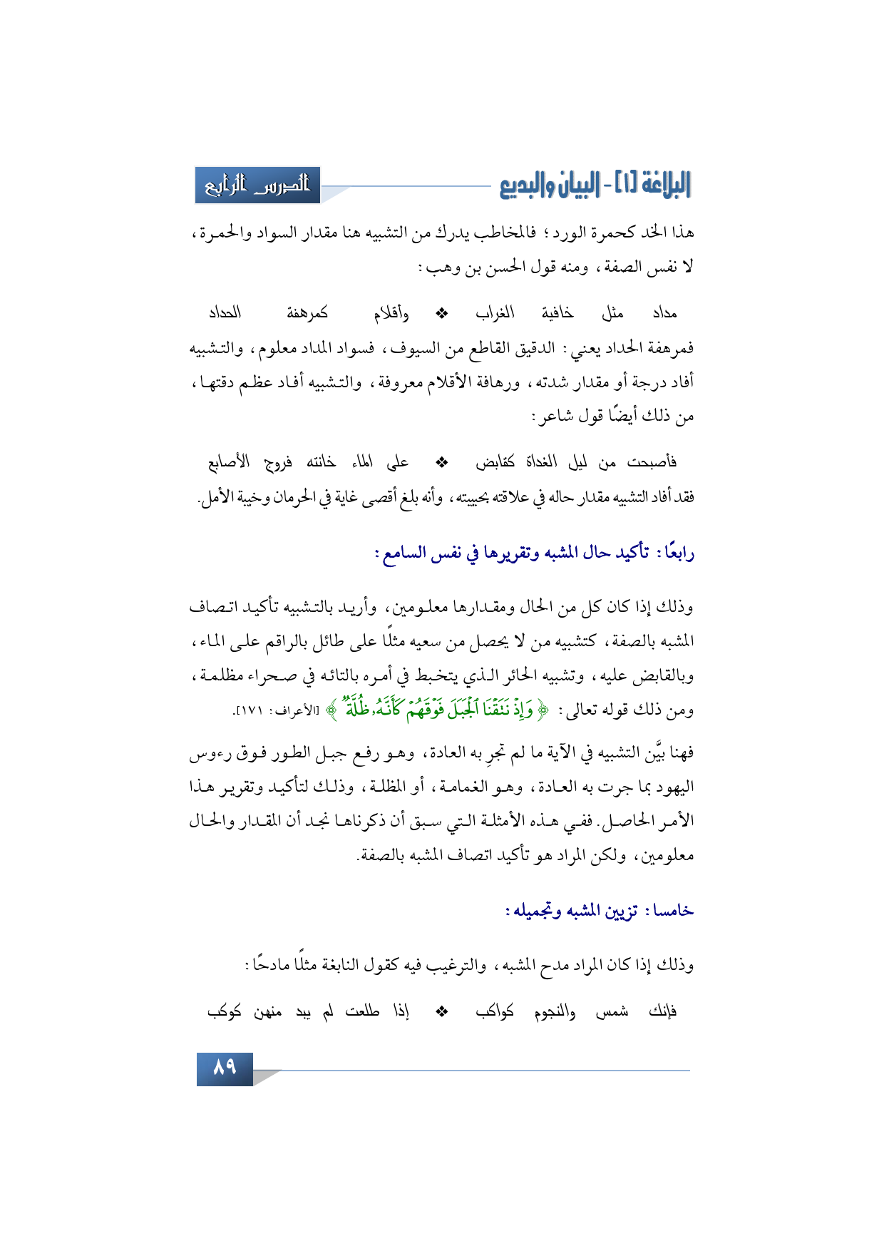 هذا الخد كحمرة الورد؛ فالمخاطب يدرك من التشبيه هنا مقدار السواد والحمرة، لا نفس الصفة، ومنه قول الحسن بن وهب: