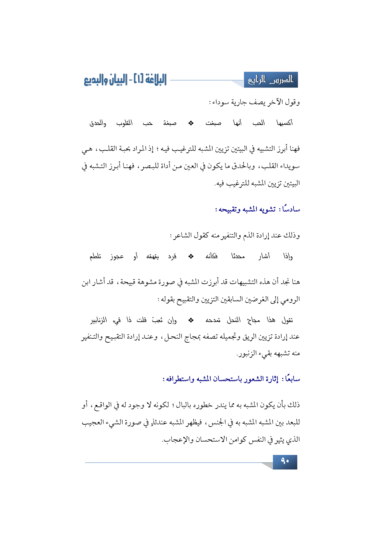عند فعند إرادة تزيين الريق وتجميله نصفه بمجاج النحل، وعند إرادة التقبيح والتنفير منه نشبهه بقيء الزنبور، من هذه الأغراض التي تعود على المشبه إثارة الشعور باستحسان المشبه واستطرافه، ذلك بأن يكون المشبه به مما يندر خطوره بالبال؛ لكونه لا وجود له في الواقع، أو للبعد بين المشبه المشبه به في الجنس، فيظهر المشبه عندئذٍ في صورة الشيء العجيب الذي يثير في النفس كوامن الاستحسان والإعجاب.