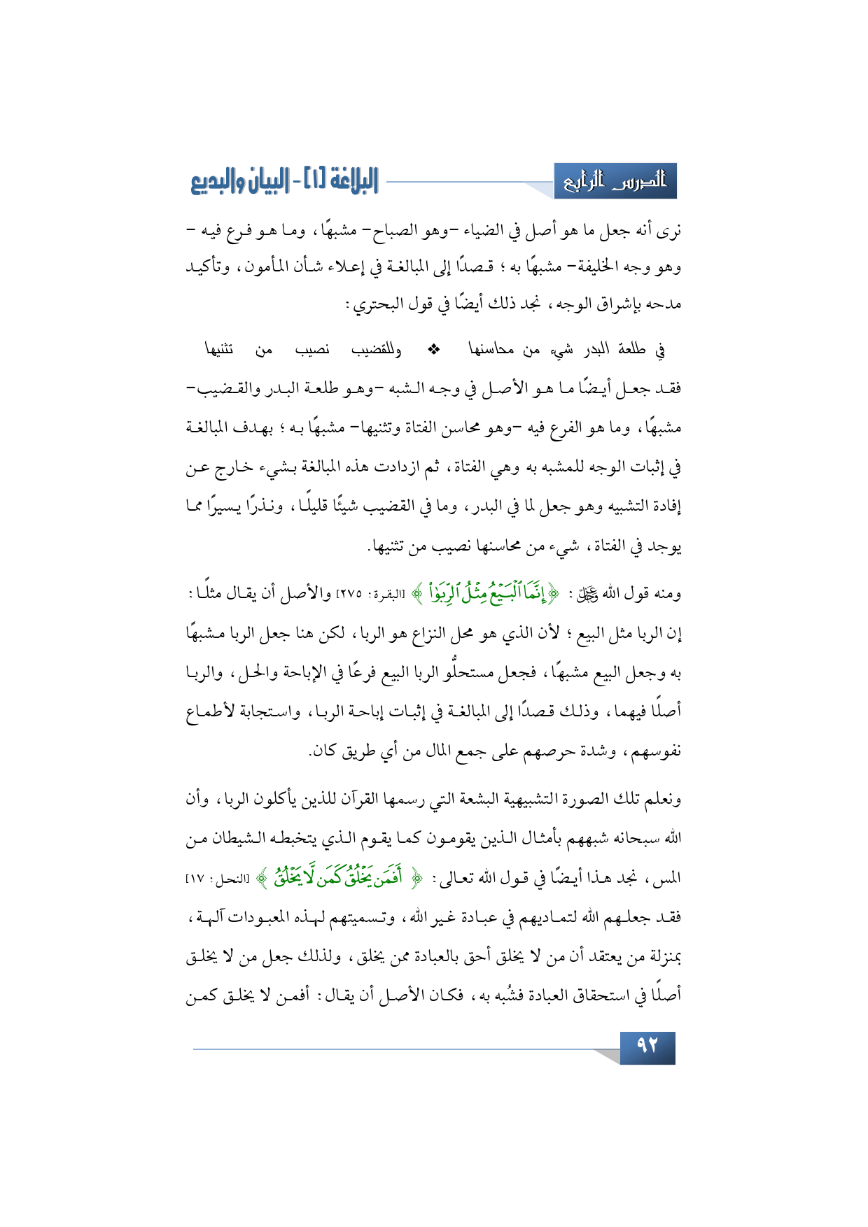 ونعلم تلك الصورة التشبيهية البشعة التي رسمها القرآن للذين يأكلون الربا، وأن الله سبحانه شبههم بأمثال الذين يقومون كما يقوم الذي يتخبطه الشيطان من المس، نجد هذا أيضًا في قول الله تعالى: {أَفَمَنْ يَخْلُقُ كَمَنْ لَا يَخْلُقُ} (النحل: 17) فقد جعلهم الله لتماديهم في عبادة غير الله، وتسميتهم لهذه المعبودات آلهة، بمنزلة من يعتقد أن من لا يخلق أحق بالعبادة ممن يخلق، ولذلك جعل من لا يخلق أصلًا في استحقاق العبادة فشُبه به، فكان الأصل أن يقال: أفمن لا يخلق كمن