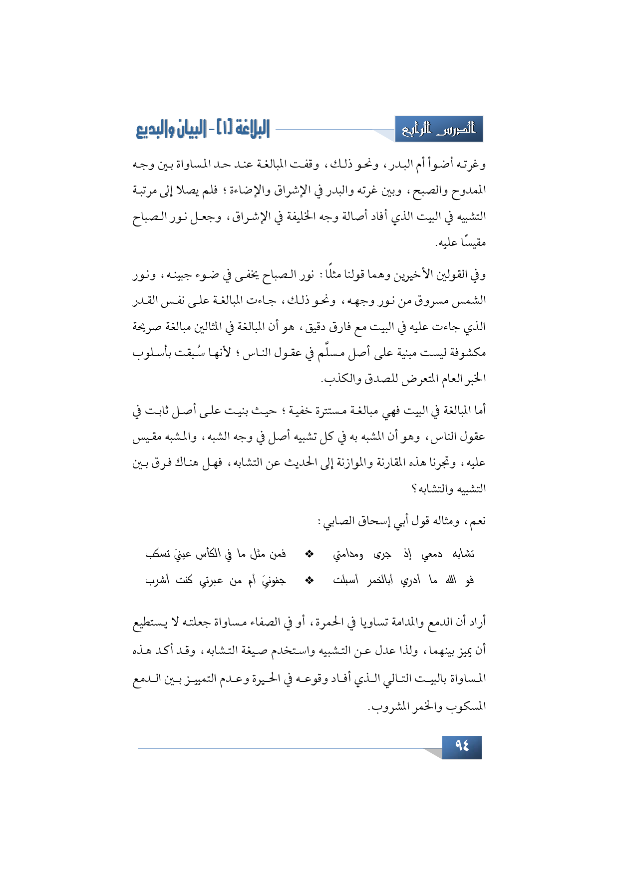 وغرته أضوأ أم البدر، ونحو ذلك، وقفت المبالغة عند حد المساواة بين وجه الممدوح والصبح، وبين غرته والبدر في الإشراق والإضاءة؛ فلم يصلا إلى مرتبة التشبيه في البيت الذي أفاد أصالة وجه الخليفة في الإشراق، وجعل نور الصباح مقيسًا عليه.