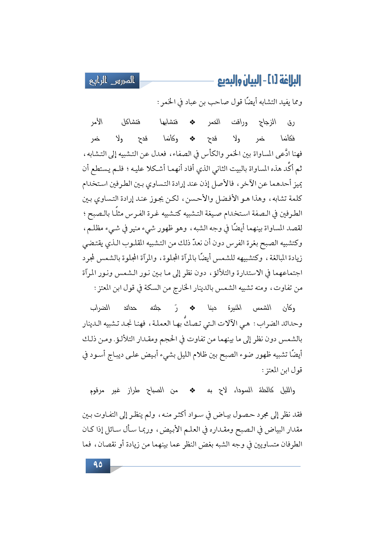 فهنا ادَّعى المساواة بين الخمر والكأس في الصفاء، فعدل عن التشبيه إلى التشابه، ثم أكَّد هذه المساواة بالبيت الثاني الذي أفاد أنهم أشكلا عليه؛ فلم يستطع أن يميز أحدهما عن الآخر، فالأصل إذن عند إرادة التساوي بين الطرفين استخدام كلمة تشابه، وهذا هو الأفضل والأحسن، لكن يجوز عند إرادة التساوي بين الطرفين في الصفة استخدام صيغة التشبيه كتشبيه غرة الفرس مثلًا بالصبح؛ لقصد المساواة بينهما أيضًا في وجه الشبه، وهو ظهور شيء منير في شيء مظلم، وكتشبيه الصبح بغرة الفرس دون أن نعدُّ ذلك من التشبيه المقلوب الذي يقتضي زيادة المبالغة، وكتشبيهه للشمس أيضًا بالمرآة المجلوة، والمرآة المجلوة بالشمس لمجرد اجتماعهما في الاستدارة والتلألؤ، دون نظر إلى ما بين نور الشمس ونور المرآة من تفاوت، ومنه تشبيه الشمس بالدينار الخارج من السكة في قول ابن المعتز: