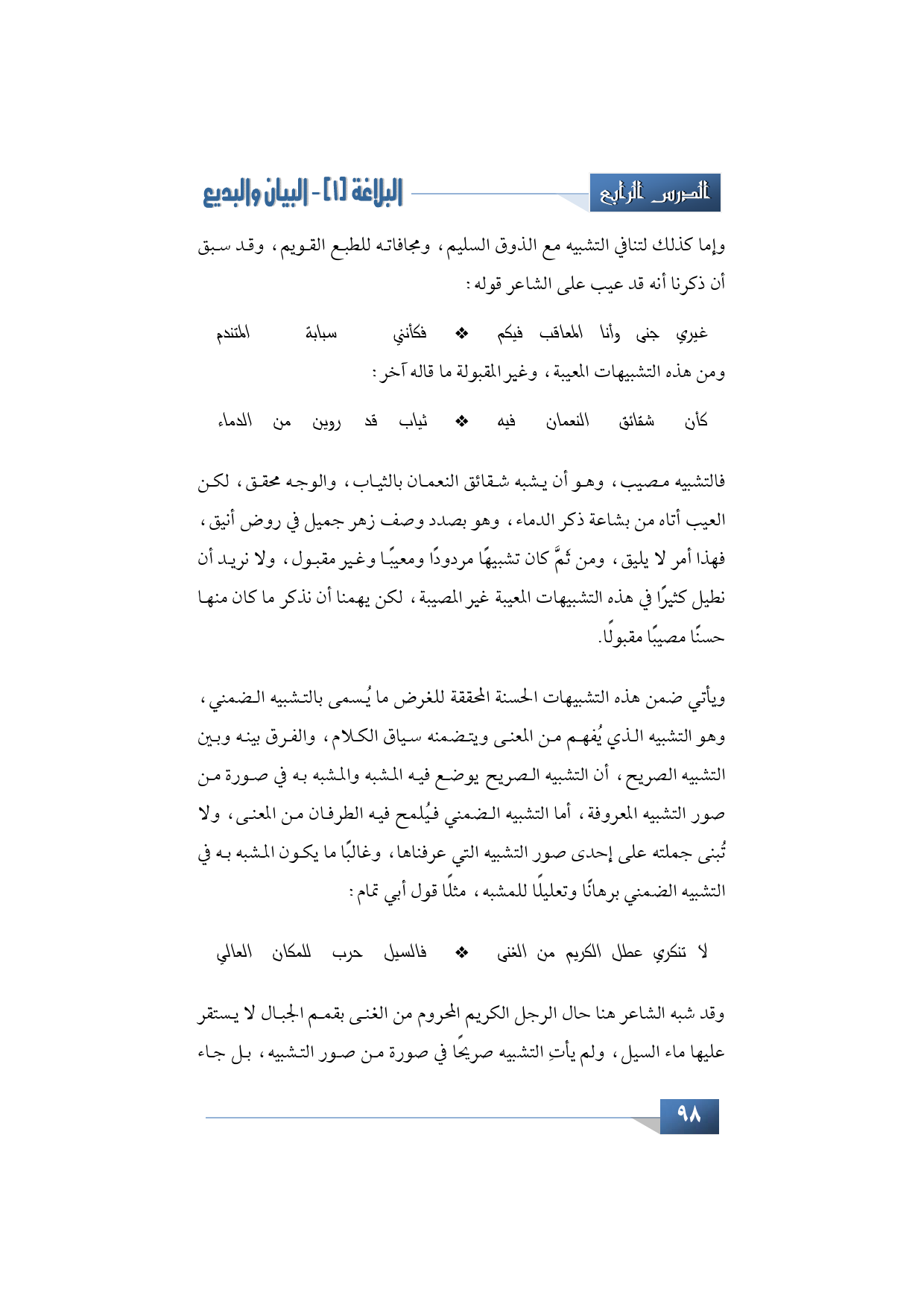 فالتشبيه مصيب، وهو أن يشبه شقائق النعمان بالثياب، والوجه محقق، لكن العيب أتاه من بشاعة ذكر الدماء، وهو بصدد وصف زهر جميل في روض أنيق، فهذا أمر لا يليق، ومن ثَمَّ كان تشبيهًا مردودًا ومعيبًا وغير مقبولة، ولا نريد أن نطيل كثيرًا في هذه التشبيهات المعيبة غير المصيبة، لكن يهمنا أن نذكر ما كان منها حسنًا مصيبًا مقبولًا.