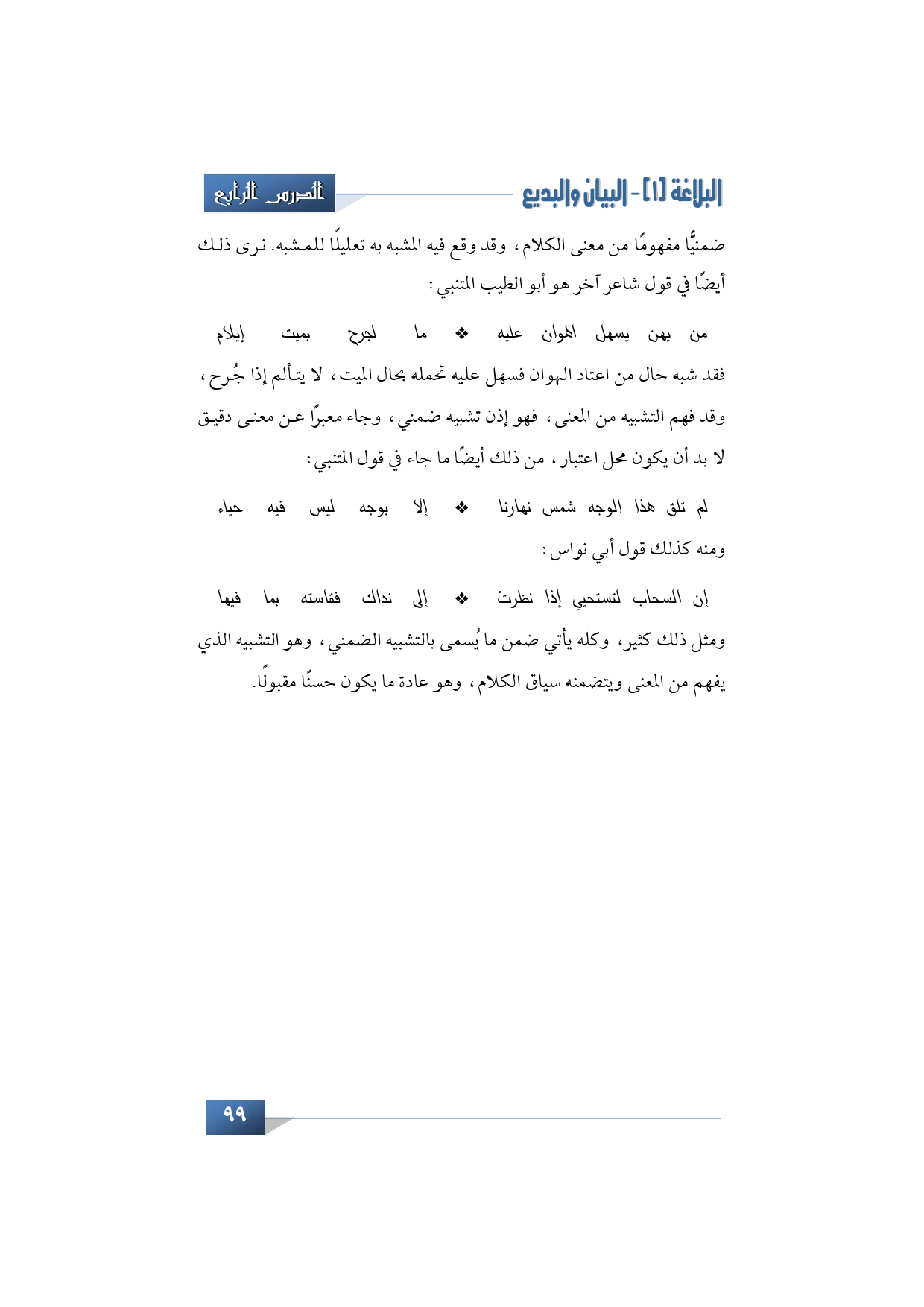 ضمنيًّا مفهومًا من معنى الكلام، وقد وقع فيه المشبه به تعليلًا للمشبه. نرى ذلك أيضًا في قول شاعر آخر هو أبو الطيب المتنبي: