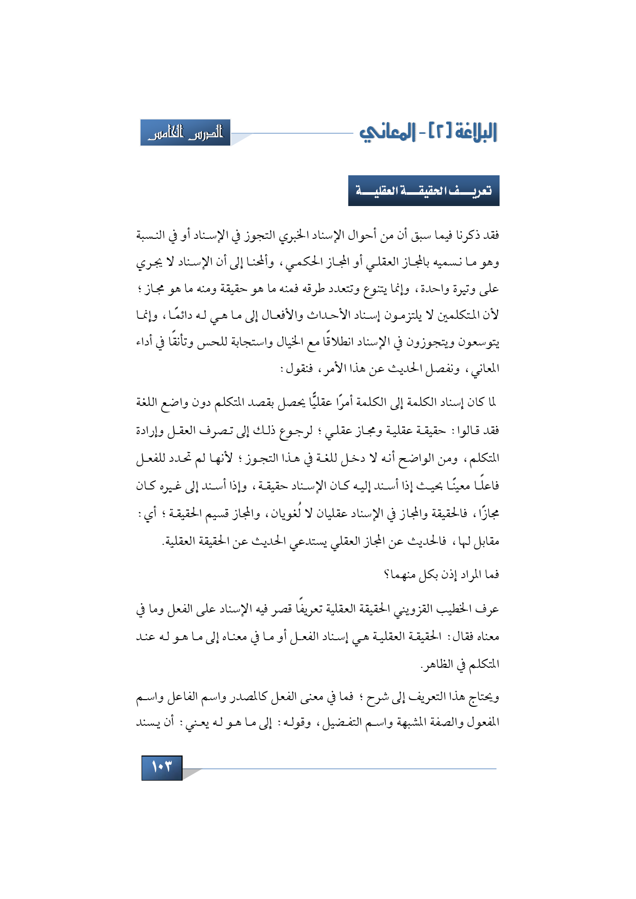 عرف الخطيب القزويني الحقيقة العقلية تعريفًا قصر فيه الإسناد على الفعل وما في معناه فقال: الحقيقة العقلية هي إسناد الفعل أو ما في معناه إلى ما هو له عند المتكلم في الظاهر. هذا موجود في كتاب (الإيضاح) ويحتاج هذا التعريف إلى شرح؛ فما في معنى الفعل كالمصدر واسم الفاعل واسم المفعول والصفة المشبهة واسم التفضيل، وقوله: إلى ما هو له يعني: أن يسند