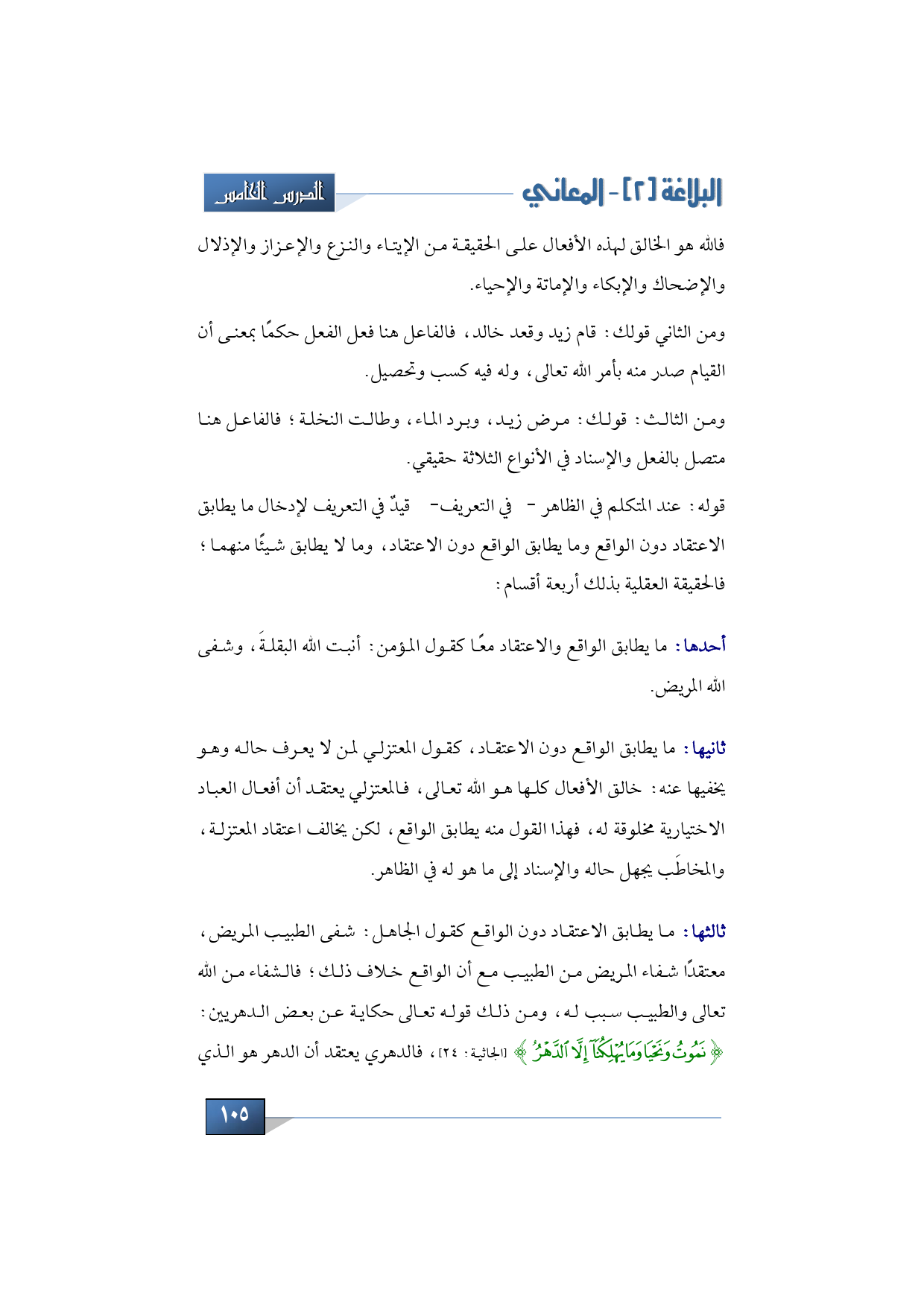 ثالثها: ما يطابق الاعتقاد دون الواقع كقول الجاهل: شفى الطبيب المريض، معتقدًا شفاء المريض من الطبيب مع أن الواقع خلاف ذلك؛ فالشفاء من الله تعالى والطبيب سبب له، ومن ذلك قوله تعالى حكاية عن بعض الدهريين: {نَمُوتُ وَنَحْيَا وَمَا يُهْلِكُنَا إِلَّا الدَّهْرُ} (الجاثية: 24)، فالدهري يعتقد أن الدهر هو الذي