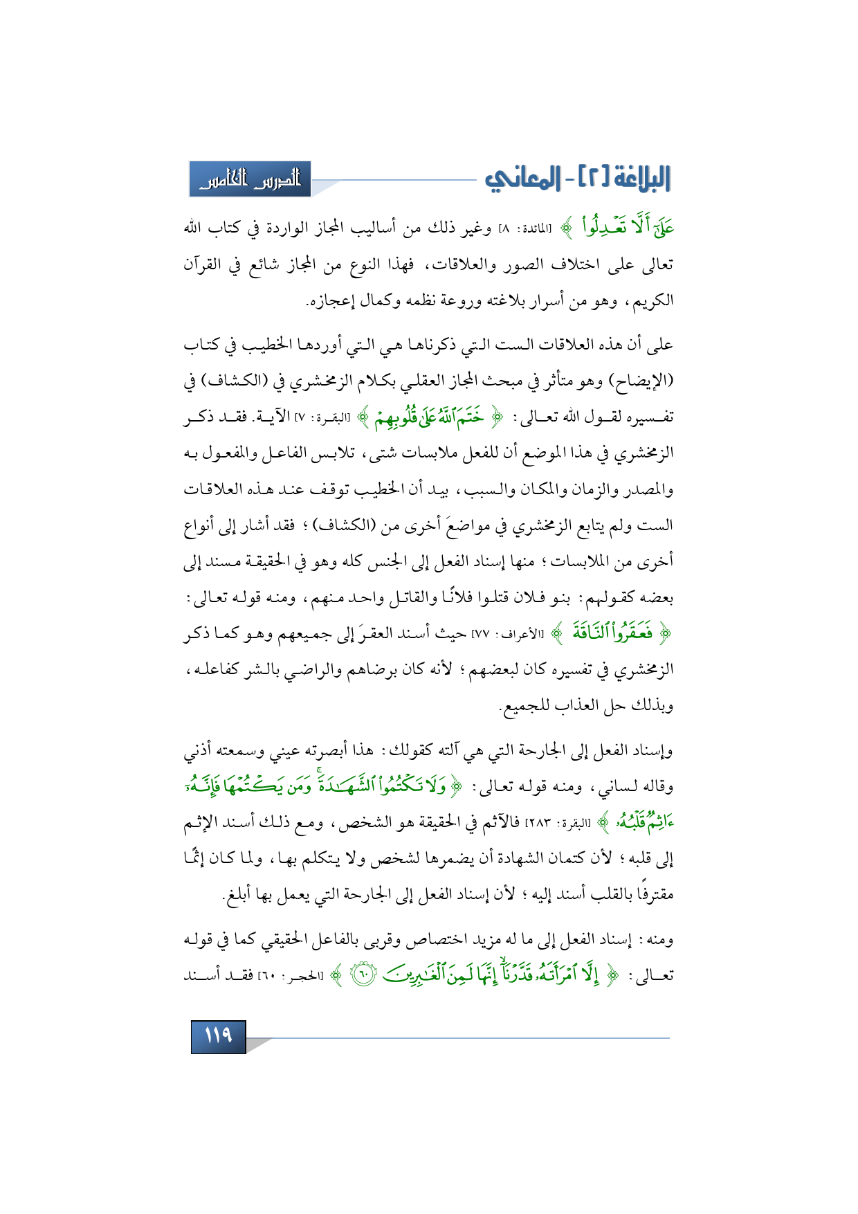 على أن هذه العلاقات الست التي ذكرناها هي التي أوردها الخطيب في كتاب (الإيضاح) وهو متأثر في مبحث المجاز العقلي بكلام الزمخشري في (الكشاف) في تفسيره لقول الله تعالى: {خَتَمَ اللَّهُ عَلَى قُلُوبِهِمْ} (البقرة: 7) الآية. فقد ذكر الزمخشري في هذا الموضع أن للفعل ملابسات شتى، تلابس الفاعل والمفعول به والمصدر والزمان والمكان والسبب، بيد أن الخطيب توقف عند هذه العلاقات الست ولم يتابع الزمخشري في مواضعَ أخرى من (الكشاف)؛ فقد أشار إلى أنواع أخرى من الملابسات؛ منها إسناد الفعل إلى الجنس كله وهو في الحقيقة مسند إلى بعضه كقولهم: بنو فلان قتلوا فلانًا والقاتل واحد منهم، ومنه قوله تعالى: {فَعَقَرُوا النَّاقَةَ} (الأعراف: 77) حيث أسند العقرَ إلى جميعهم وهو كما ذكر الزمخشري في تفسيره كان لبعضهم؛ لأنه كان برضاهم والراضي بالشر كفاعله، وبذلك حل العذاب للجميع.