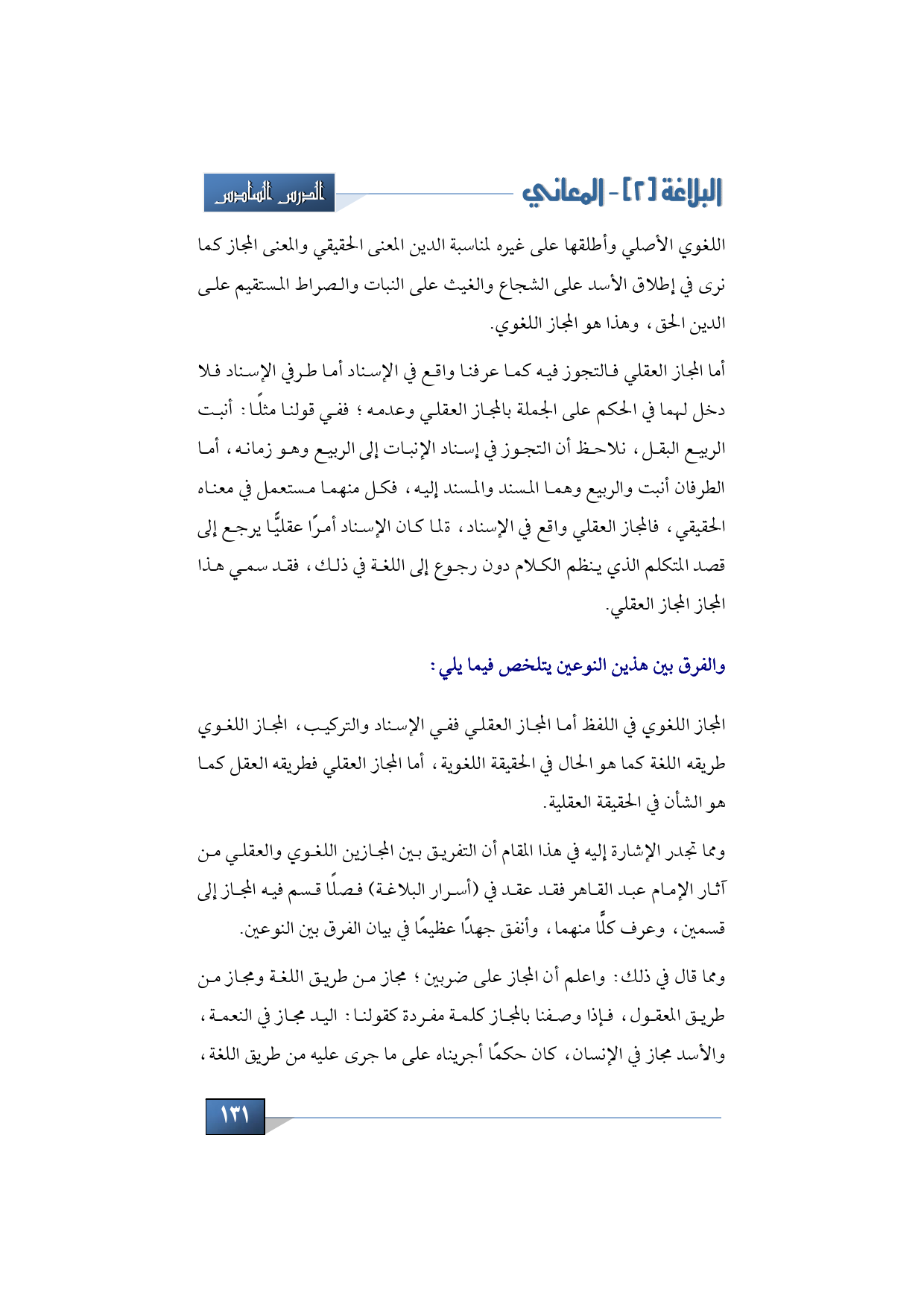 ومما تجدر الإشارة إليه في هذا المقام أن التفريق بين المجازين اللغوي والعقلي من آثار الإمام عبد القاهر فقد عقد في (أسرار البلاغة) فصلًا قسم فيه المجاز إلى قسمين، وعرف كلًّا منهما، وأنفق جهدًا عظيمًا في بيان الفرق بين النوعين.