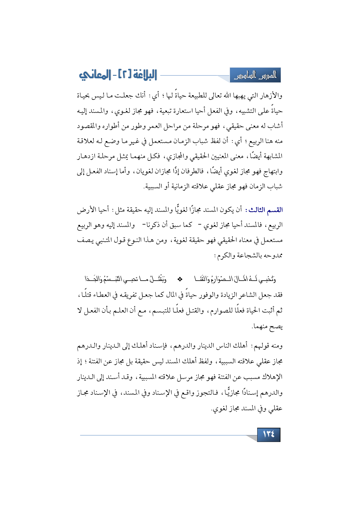 والأزهار التي يهبها الله تعالى للطبيعة حياةً لها؛ أي: أنك جعلت ما ليس بحياة حياةً على التشبيه، وفي الفعل أحيا استعارة تبعية، فهو مجاز لغوي، والمسند إليه أشاب له معنى حقيقي، فهو مرحلة من مراحل العمر وطور من أطواره والمقصود منه هنا الربيع؛ أي: أن لفظ شباب الزمان مستعمل في غير ما وضع له لعلاقة المشابهة أيضًا، معنى المعنيين الحقيقي والمجازي، فكل منهما يمثل مرحلة ازدهار وابتهاج فهو مجاز لغوي أيضًا، فالطرفان إذن مجازان لغويان، وأما إسناد الفعل إلى شباب الزمان فهو مجاز عقلي علاقته الزمانية أو السببية.