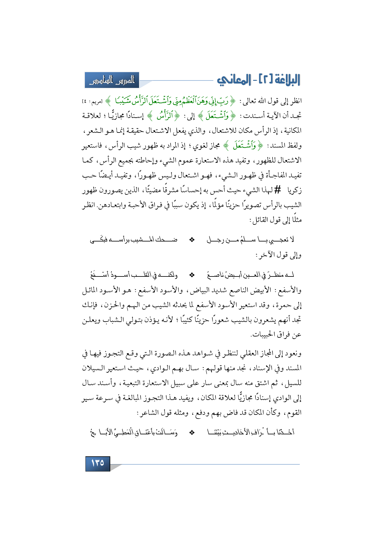انظر إلى قول الله تعالى: {رَبِّ إِنِّي وَهَنَ الْعَظْمُ مِنِّي وَاشْتَعَلَ الرَّأْسُ شَيْبًا} (مريم: 4) تجد أن الآية أسند ت: {اشْتَعَلَ} إلى: {الرَّأْس} إسنادًا مجازيًّا؛ لعلاقة المكانية، إذ الرأس مكان للاشتعال، والذي يفعل الاشتعال حقيقة إنما هو الشعر، ولفظ المسند: {اشْتَعَلَ} مجاز لغوي؛ إذ المراد به ظهور شيب الرأس، فاستعير الاشتعال للظهور، وتفيد هذه الاستعارة عموم الشيء وإحاطته بجميع الرأس، كما تفيد المفاجأة في ظهور الشيء، فهو اشتعال وليس ظهورًا، وتفيد أيضًا حب زكريا -عليه السلام- لهذا الشيء حيث أحس به إحساسًا مشرقًا مضيئًا، الذين يصورون ظهور الشيب بالرأس تصويرًا حزينًا مؤلمًا، إذ يكون سببًا في فراق الأحبة وابتعادهن.