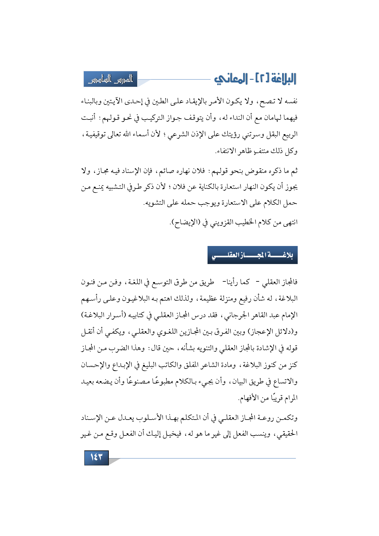 فالمجاز العقلي -كما رأينا- طريق من طرق التوسع في اللغة، وفن من فنون البلاغة، له شأن رفيع ومنزلة عظيمة، ولذلك اهتم به البلاغيون وعلى رأسهم الإمام عبد القاهر الجرجاني، ف قد درس المجاز العقلي في كتابيه (أسرار البلاغة) و (دلائل الإعجاز) وبين الفرق بين المجازين اللغوي والعقلي، ويكفي أن أنقل قوله في الإشادة بالمجاز العقلي والتنويه بشأنه، حين قال: وهذا الضرب من المجاز كنز من كنوز البلاغة، ومادة الشاعر المفلق والكاتب البليغ في الإبداع والإحسان والاتساع في طريق البيان، وأن يجيء بالكلام مطبوعًا مصنوعًا وأن يضعه بعيد المرام قريبًا من الأفهام. كذا في (الدلائل).
