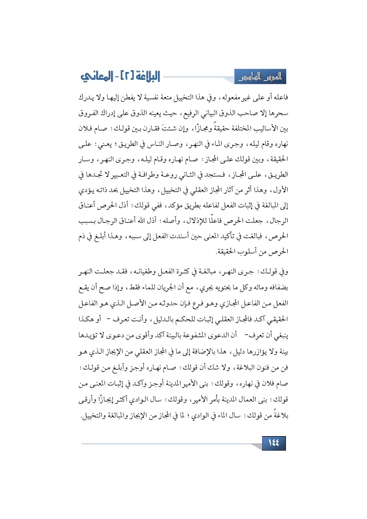 وفي قولك: جرى النهر، مبالغة في كثرة الفعل وطغيانه، ف قد جعلت النهر بضفافه ومائه وكل ما يحتويه يجري، مع أن الجريان للماء فقط، وإذا صح أن يقع الفعل من الفاعل المجازي وهو فرع فإن حدوثه من الأصل الذي هو الفاعل الحقيقي آكد فالمجاز العقلي إثبات للحكم بالدليل، وأنت تعرف -أو هكذا ينبغي أن تعرف- أن الدعوة المشفوعة بالبينة آكد وأقوى من دعوى لا تؤيدها بينة ولا يؤازرها دليل، هذا بالإضافة إلى ما في المجاز العقلي من الإيجاز الذي هو فن من فنون البلاغة، ولا شك أن قولك: صام نهاره أوجز وأبلغ من قولك: صام فلان في نهاره، وقولك: بنى الأمير المدينة أوجز وآكد في إثبات المعنى من قولك: بنى العمال المدينة بأمر الأمير، وقولك: سال الوادي أكثر إيجازًا وأرقى بلاغةً من قولك: سال الماء في الوادي؛ لما في المجاز من الإيجاز والمبالغة والتخييل.