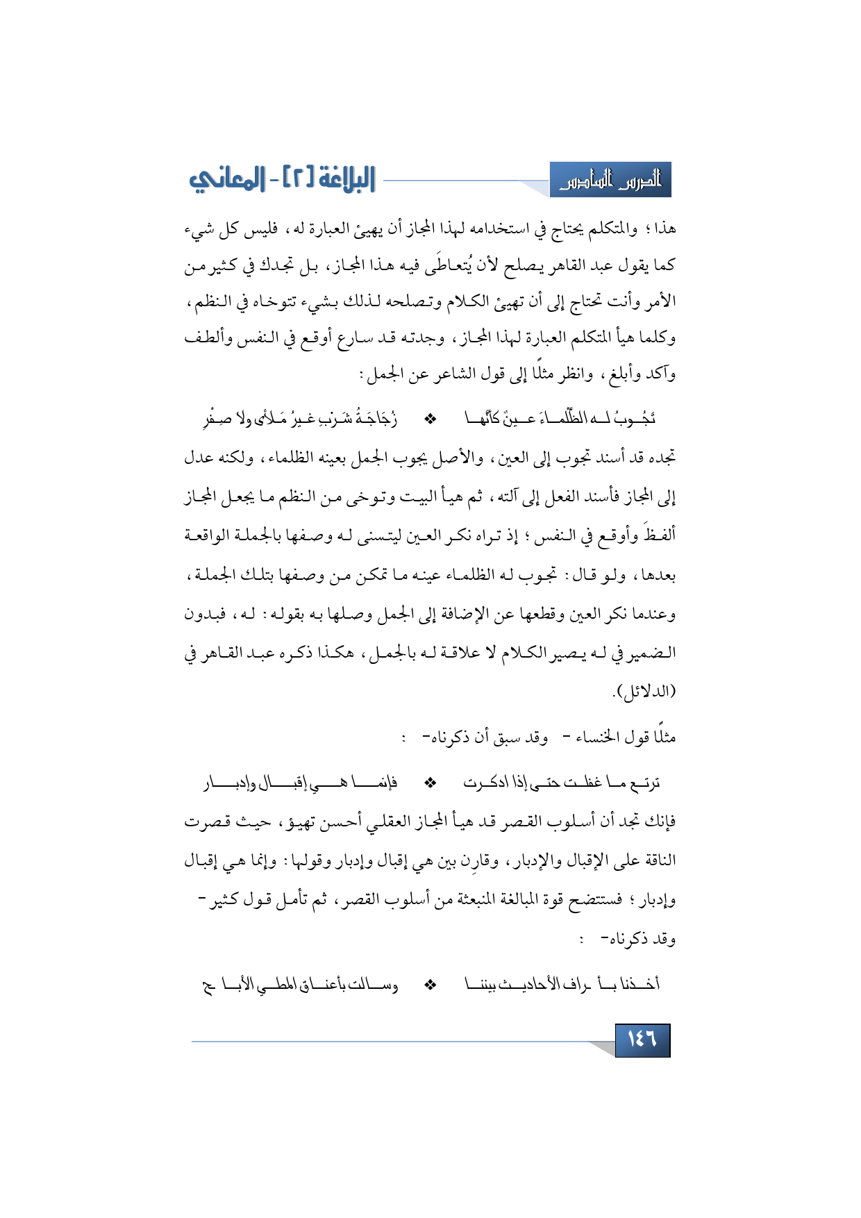 فإنك تجد أن أسلوب القصر قد هيأ المجاز العقلي أحسن تهيؤ، حيث قصرت الناقة على الإقبال والإدبار، وقارِن بين هي إقبال وإدبار وقولها: وإنما هي إقبال وإدبار؛ فستضح لك قوة المبالغة المنبعثة من أسلوب القصر، ثم تأمل قول كثير -وقد ذكرناه-: