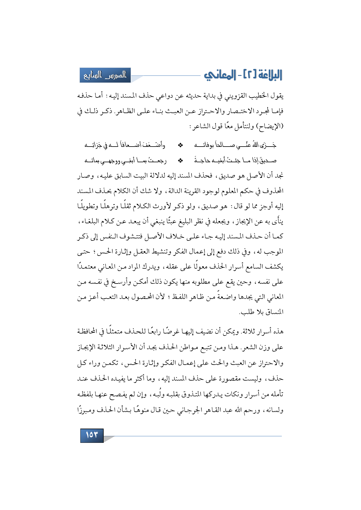 هذه أسرار ثلاثة. ويمكن أن نضيف إليها غرضًا رابعًا للح ذف متمثلًا في المحافظة على وزن الشعر. هذا ومن تتبع مواطن الحذف يجد أن الأسرار الثلاثة الإيجاز والاحتراز عن العبث والحث على إعمال الفكر وإثارة الحس، تكمن وراء كل حذف، وليست مقصورة على حذف المسند إليه، وما أكثر ما يفيده الحذف عند تأمله من أسرار ونكات يدركها المتذوق بقلبه ولُبه، وإن لم يفصح عنها بلفظه ولسانه ورحم الله عبد القاهر الجرجاني حين قال منوهًا بشأن الحذف ومبرزًا