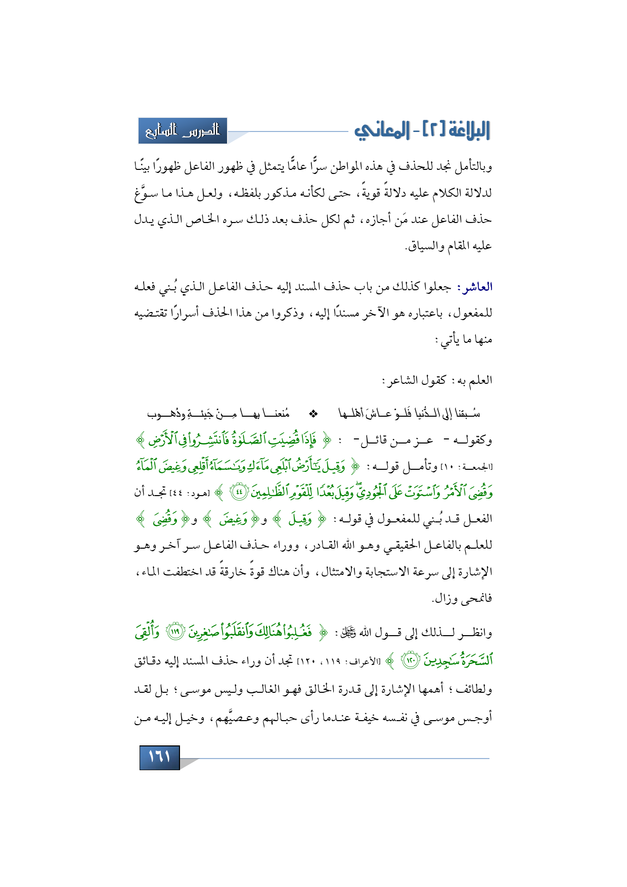 وكقوله -عز من قائل -: {فَإِذَا قُضِيَتِ الصَّلَاةُ فَانْتَشِرُوا فِي الْأَرْضِ} (الجمعة: 10) وتأمل قوله: {وقِيلَ يَا أَرْضُ ابْلَعِي مَاءَكِ وَيَا سَمَاءُ أَقْلِعِي وَغِيضَ الْمَاءُ وَقُضِيَ الْأَمْرُ وَاسْتَوَتْ عَلَى الْجُودِيِّ وَقِيلَ بُعْدًا لِلْقَوْمِ الظَّالِمِينَ} (هود: 44) تجد أن الفعل قد بني للمفعول في قوله: {قِيلَ} و {غِيضَ} و {قُضِي} للعلم بالفاعل الحقيقي وهو الله القادر، ووراء حذف الفاعل سر آخر وهو الإشارة إلى سرعة الاستجابة والامتثال، وأن هناك قوةً خارقةً قد اختطفت الماء، فانمحى وزال.
