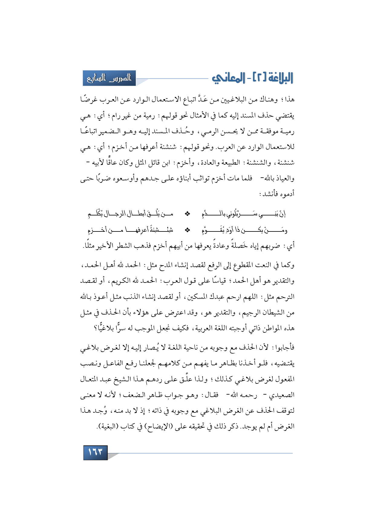 فأجابوا: لأن الحذف مع وجوبه من ناحية اللغة لا يُصار إليه إلا لغرض بلاغي يقتضيه، فلو أخذنا بظاهر ما يفهم من كلامهم لجعلنا رفع الفاعل ونصب المفعول لغرض بلاغي كذلك؛ ولذا علَّق على ردهم هذا الشيخ عبد المتعال الصعيدي - رحمه الله - فقال: وهو جواب ظاهر الضعف؛ لأنه لا معنى لتوقف الحذف عن الغرض البلاغي مع وجوبه في ذاته، إذ لا بد منه، وُجد هذا الغرض أم لم يوجد. ذكر ذلك في تحقيقه على (الإيضاح) في كتاب البغية.
