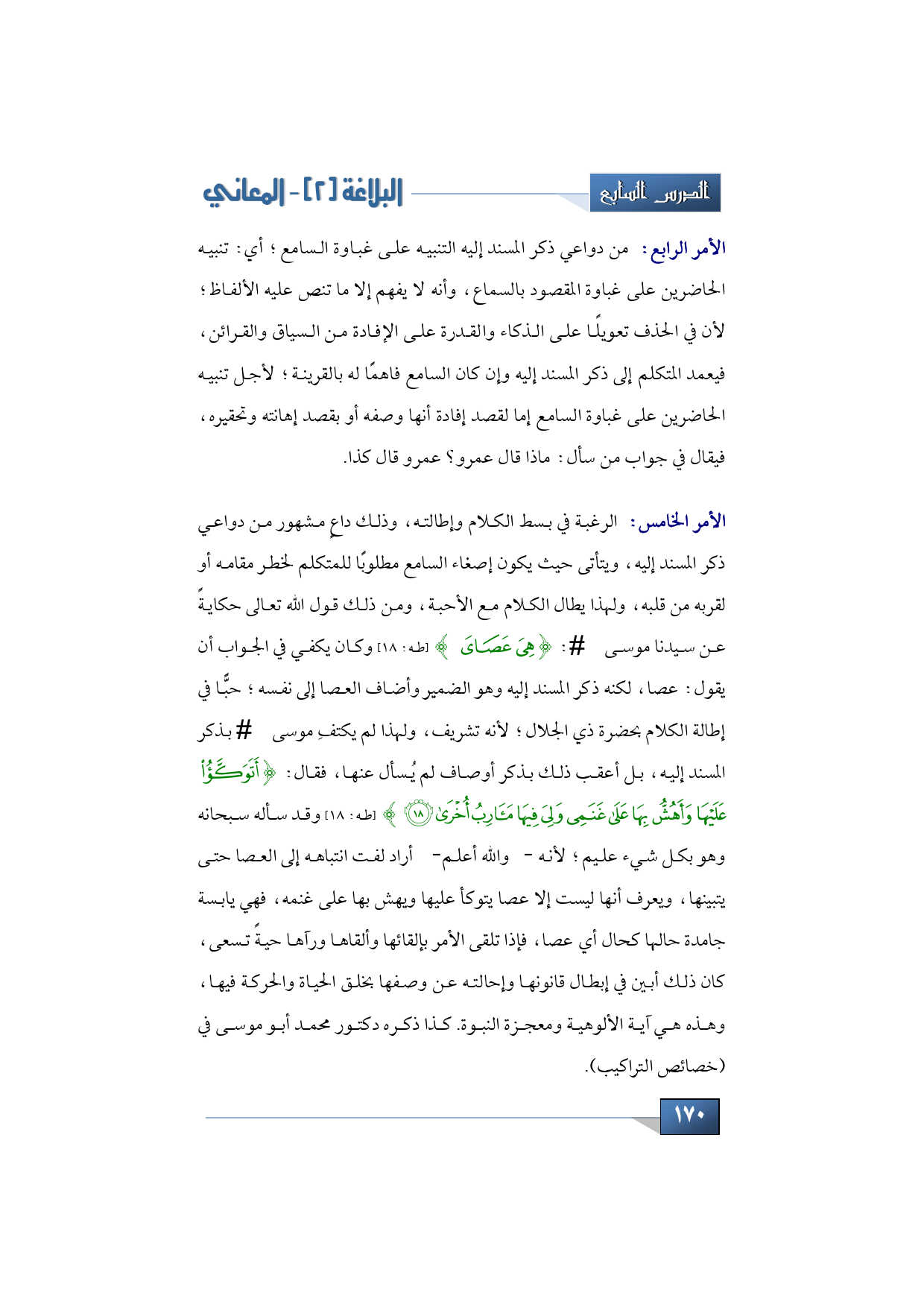من ذلك أيضًا: الرغبة في بسط الكلام وإطالته، وذلك داع مشهور من دواعي ذكر المسند إليه، ويتأتى حيث يكون إصغاء السامع مطلوبًا للمتكلم لخطر مقامه أو لقربه من قلبه، ولهذا يطال الكلام مع الأحبة، ومن ذلك قول الله تعالى حكايةً عن سيدنا موسى - عليه السلام-: {هِيَ عَصَايَ} (طه: 18) وكان يكفي في الجواب أن يقول: عصا، لكنه ذكر المسند إليه وهو الضمير وأضاف العصا إلى نفسه؛ حبًّا في إطالة الكلام بحضرة ذي الجلال؛ لأنه تشريف، ولهذا لم يكتفِ موسى - عليه السلام - بذكر المسند إليه، بل أعقب ذلك بذكر أوصاف لم يُسأل عنها، فقال: {أَتَوَكَّأُ عَلَيْهَا وَأَهُشُّ بِهَا عَلَى غَنَمِي وَلِيَ فِيهَا مَآرِبُ أُخْرَى} (طه: 18) وقد سأله سبحانه وهو بكل شيء؛ لأنه -والله أعلم- أراد لفت انتباهه إلى العصا حتى يتبينها، ويعرف أنها ليست إلا عصا يتوكأ عليها ويهش بها على غنمه، فهي يابسة جامدة حالها كحال أي عصا، فإذا تلقى الأمر بإلقائها وألقاها ورآها حيةً تسعى، كان ذلك أبين في إبطال قانونها وإحالته عن وصفها بخلق الحياة والحركة فيها، وهذه هي آية الألوهية ومعجزة النبوة.
