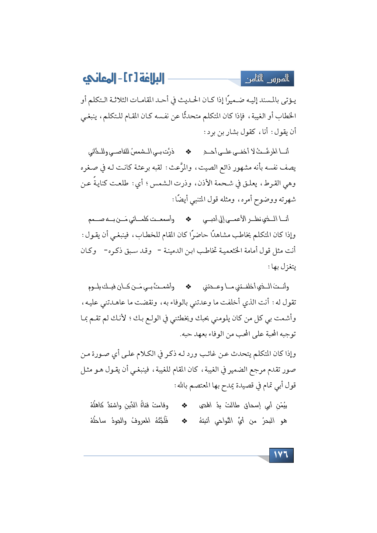 يؤتى بالمسند إليه ضميرًا إذا كان الحديث في أحد المقامات الثلاثة التكلم أو الخطاب أو الغيبة، فإذا كان المتكلم متحدثًا عن نفسه كان المقام للتكلم، ينبغي أن يقول: أنا، كقول بشار بن برد: