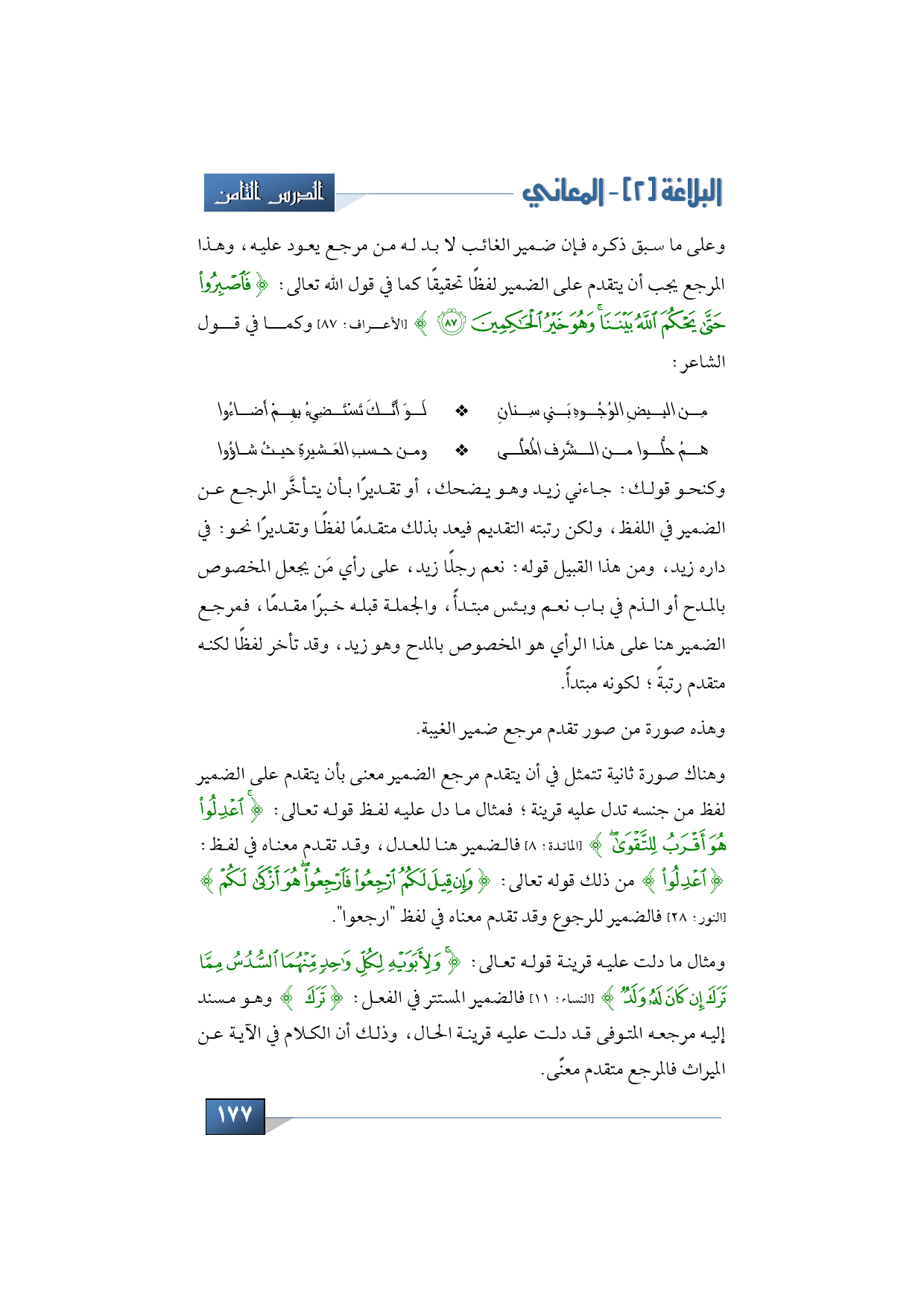 وعلى ما سبق ذكره فإن ضمير الغائب لا بد له من مرجع يعود عليه، وهذا المرجع يجب أن يتقدم على الضمير لفظًا تحقيقًا كما في قول الله تعالى: {فَاصْبِرُوا حَتَّى يَحْكُمَ اللَّهُ بَيْنَنَا وَهُوَ خَيْرُ الْحَاكِمِينَ} (الأعراف: 87) وكما في قول الشاعر: