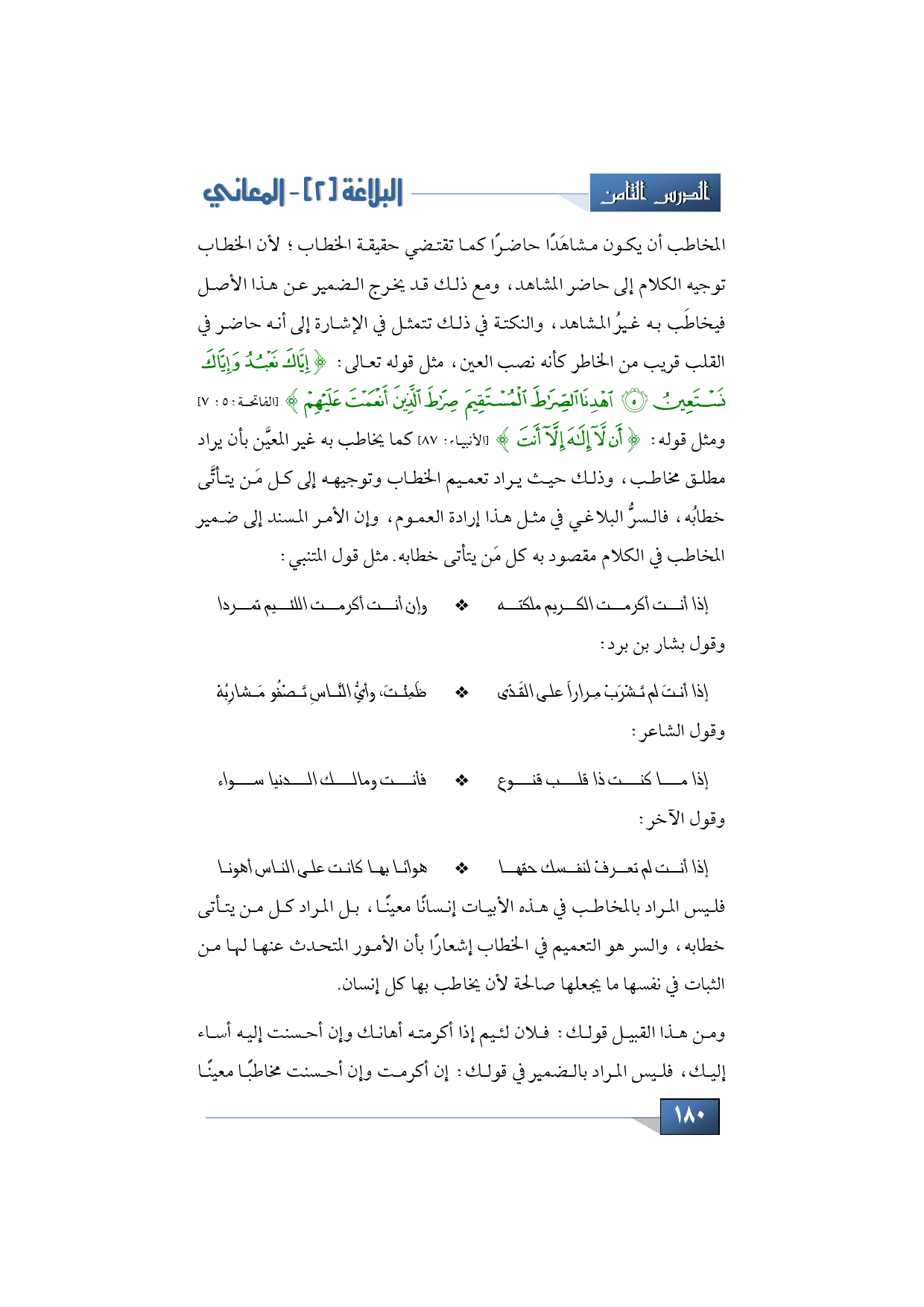 فليس المراد بالمخاطب في هذه الأبيات إنسانًا معينًا، بل المراد كل من يتأتى خطابه، والسر هو التعميم في الخطاب إشعارًا بأن الأمور المتحدث عنها لها من الثبات في نفسها ما يجعلها صالحة لأن يخاطب بها كل إنسان. ومن هذا القبيل قولك: فلان لئيم إذا أكرمته أهانك وإن أحسنت إليه أساء إليك، فليس المراد بالضمير في قولك: إن أكرمت وإن أحسنت مخاطبًا معينًا