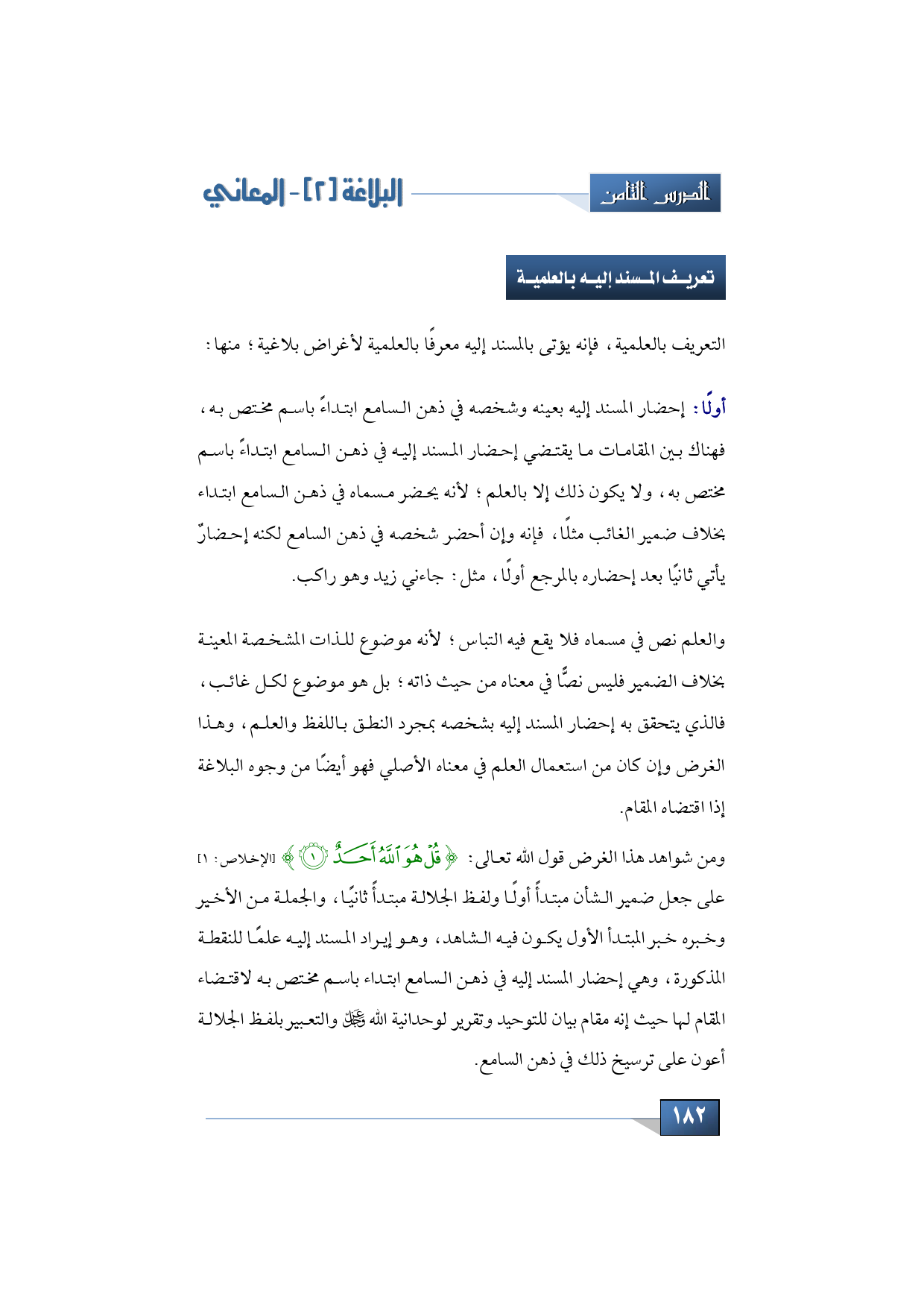 التعريف بالعلمية، فإنه يؤتى بالمسند إليه معرفًا بالعل م ية لأغراض بلاغية؛ منها: