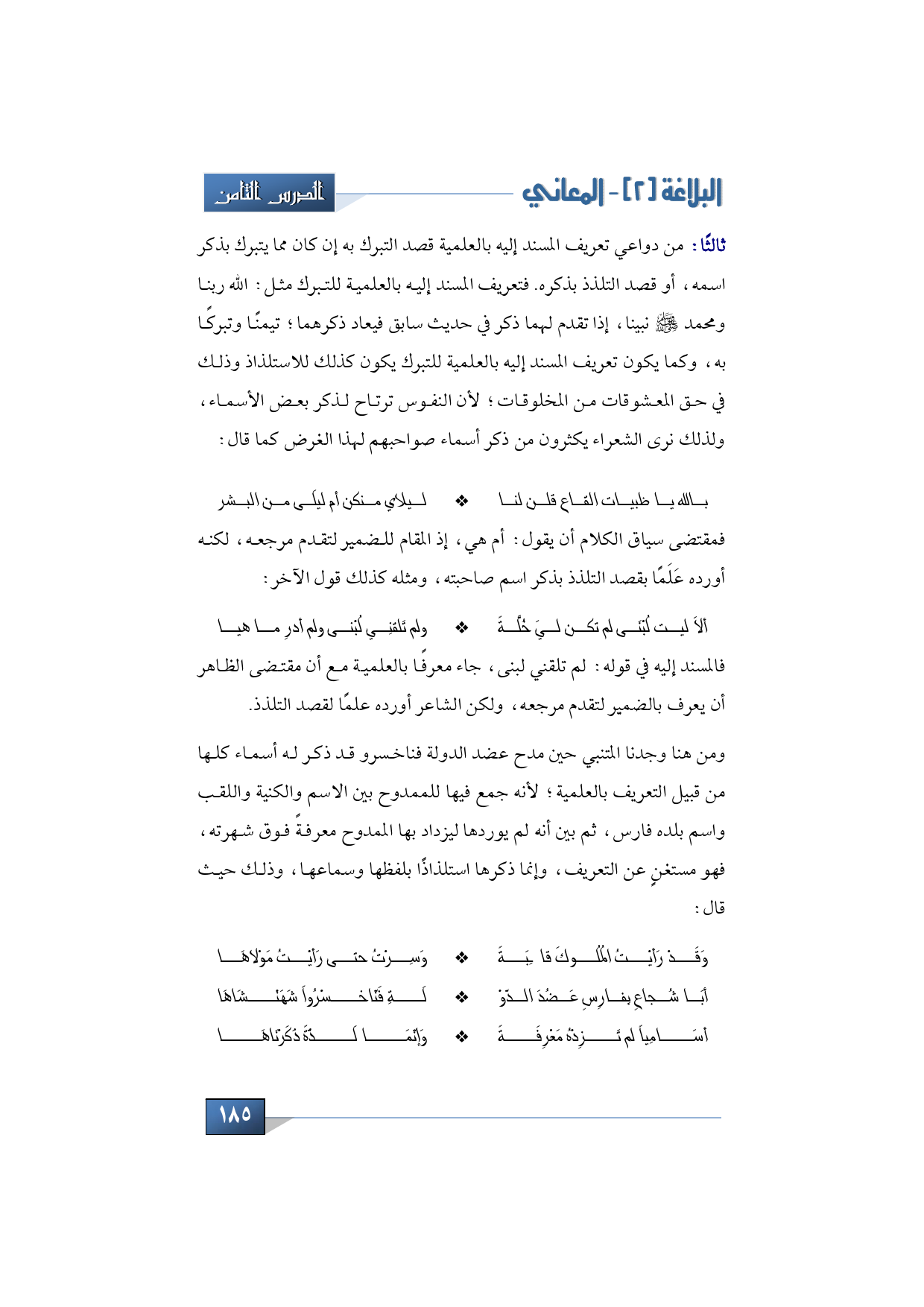 ومن هنا وجدنا المتنبي حين مدح عضد الدولة فناسخرو قد ذكر له أسماء كلها من قبيل التعريف بالعلمية؛ لأنه جمع فيها للم م دوح بين الاسم والكنية واللقب واسم بلده فارس، ثم بين أنه لم ي وردها ليزداد بها الممدوح معرفةً فوق شهرته، فهو مستغنٍ عن التعريف، وإنما ذكرها استلذاذًا بلفظها وسماعها، وذلك حيث قال: