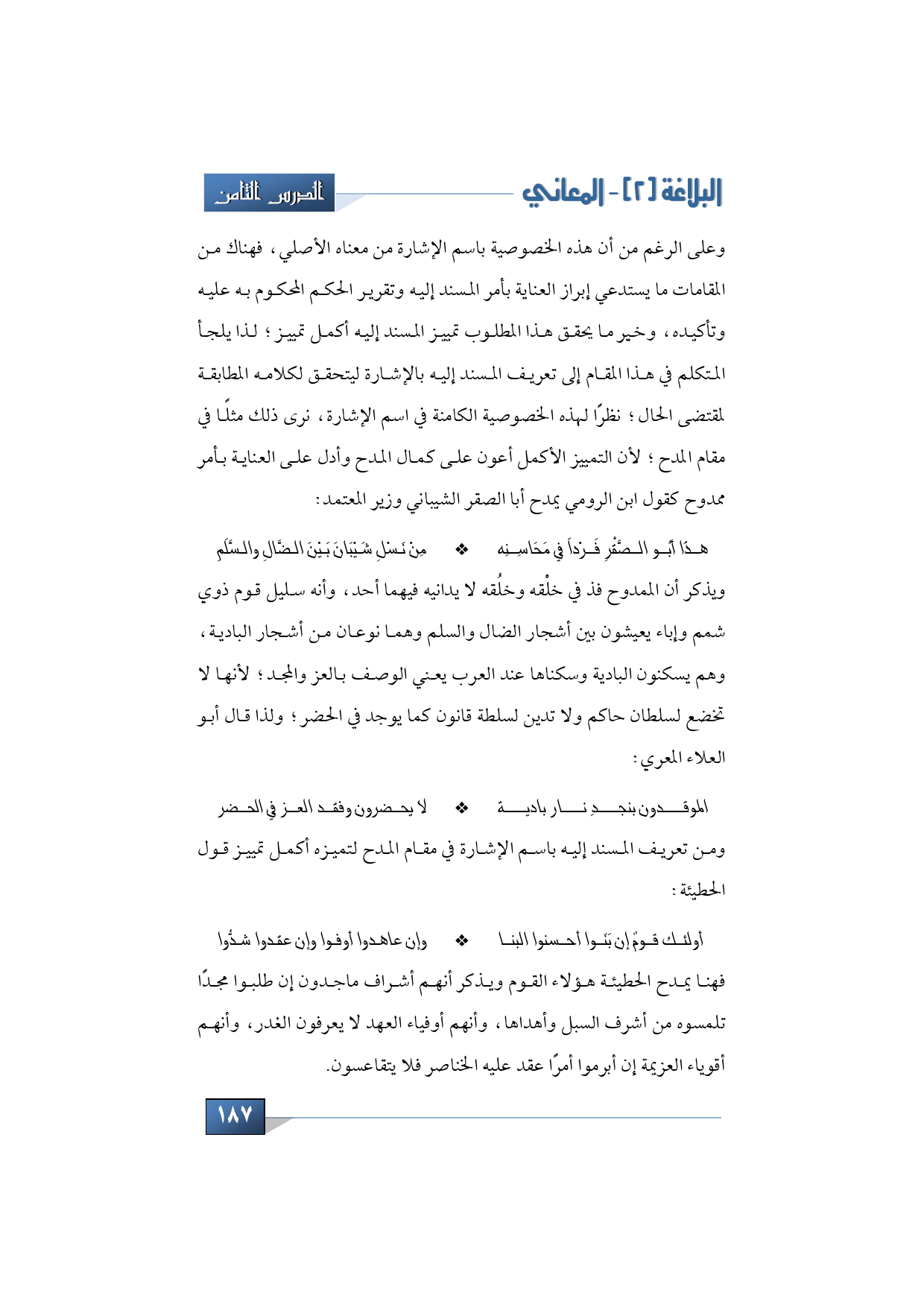 وعلى الرغم من أن هذه الخصوصية باسم الإشارة من معناه الأصلي، فهناك من المقامات ما يستدعي إبراز العناية بأمر المسند إليه وتقرير الحكم المحكوم به عليه وتأكيده، وخير ما يحقق هذا المطلوب تمييز المسند إليه أكمل تمييز؛ لذا يلجأ المتكلم في هذا المقام إلى تعريف المسند إليه بالإشارة ليتحقق لكلامه المطابقة لمقتضى الحال؛ نظرًا لهذه الخصوصية الكامنة في اسم الإشارة، نرى ذلك مثلًا في مقام المدح؛ لأن التمييز الأكمل أعون على كمال المدح وأدل على العناية بأمر ممدوح كقول ابن الرومي يمدح أبا الصقر الشيباني وزير المعتمد:
