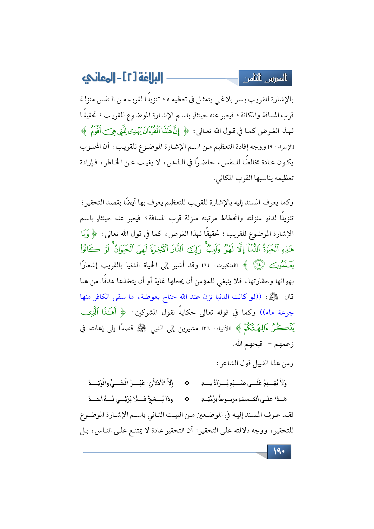 بالإشارة للقريب بسر بلاغي يتمثل في تعظيمه؛ تنزيلًا لقربه من النفس منزلة قرب المسافة والمكانة؛ فيعبر عنه حينئذٍ باسم الإشارة الموضوع للقريب؛ تحقيقًا لهذا الغرض كما في قول الله تعالى: {إِنَّ هَذَا الْقُرْآنَ يَهْدِي لِلَّتِي هِيَ أَقْوَمُ} (الإسراء: 9) ووجه إفادة التعظيم من اسم الإشارة الموضوع للقريب أن المحبوب يكون عادة مخالطًا للنفس، حاضرًا في الذهن، لا يغيب عن الخاطر، فإرادة تعظيمه يناسبها القرب المكاني.
