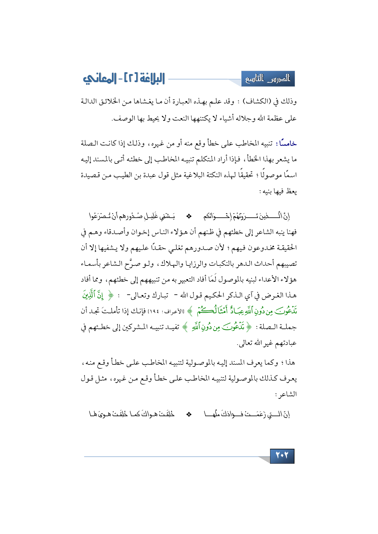 ومن دواعي تعريف المسند إليه بالموصولية أيضًا: تنبيه المخاطب على خطأ وقع منه أو من غيره، وذلك إذا كانت الصلة ما يشعر بهذا الخطأ، فإذا أراد المتكلم تنبيه المخاطب إلى خطئه أتى بالمسند إليه اسمًا موصولًا؛ تحقيقًا لهذه النكتة البلاغية مثل قول عبدة بن الطيب من قصيدة يعظ فيها بنيه: