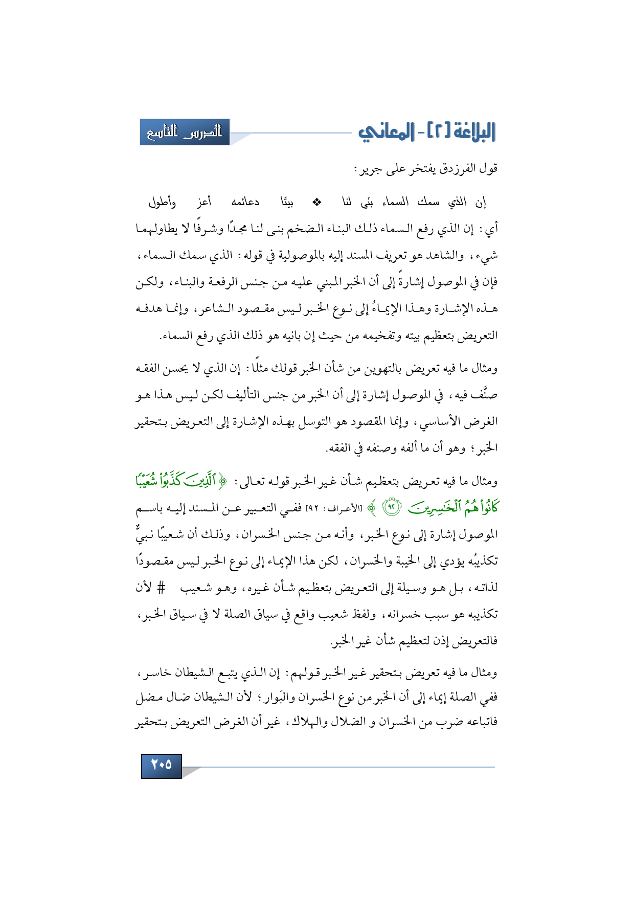 أي: إن الذي رفع السماء ذلك البناء الضخم بنى لنا مجدًا وشرفًا لا يطاولهما شيء، والشاهد هو تعريف المسند إليه بالموصولية في قوله: الذي سمك السماء، فإن في الموصول إشارةً إلى أن الخبر المبني عليه من جنس الرفعة والبناء، ولكن هذه الإشارة وهذا الإيماءُ إلى نوع الخبر ليس مقصود الشاعر، وإنما هدفه التعريض بتعظيم بيته وتفخيمه من حيث إ ن بانيه هو ذلك الذي رفع السماء.