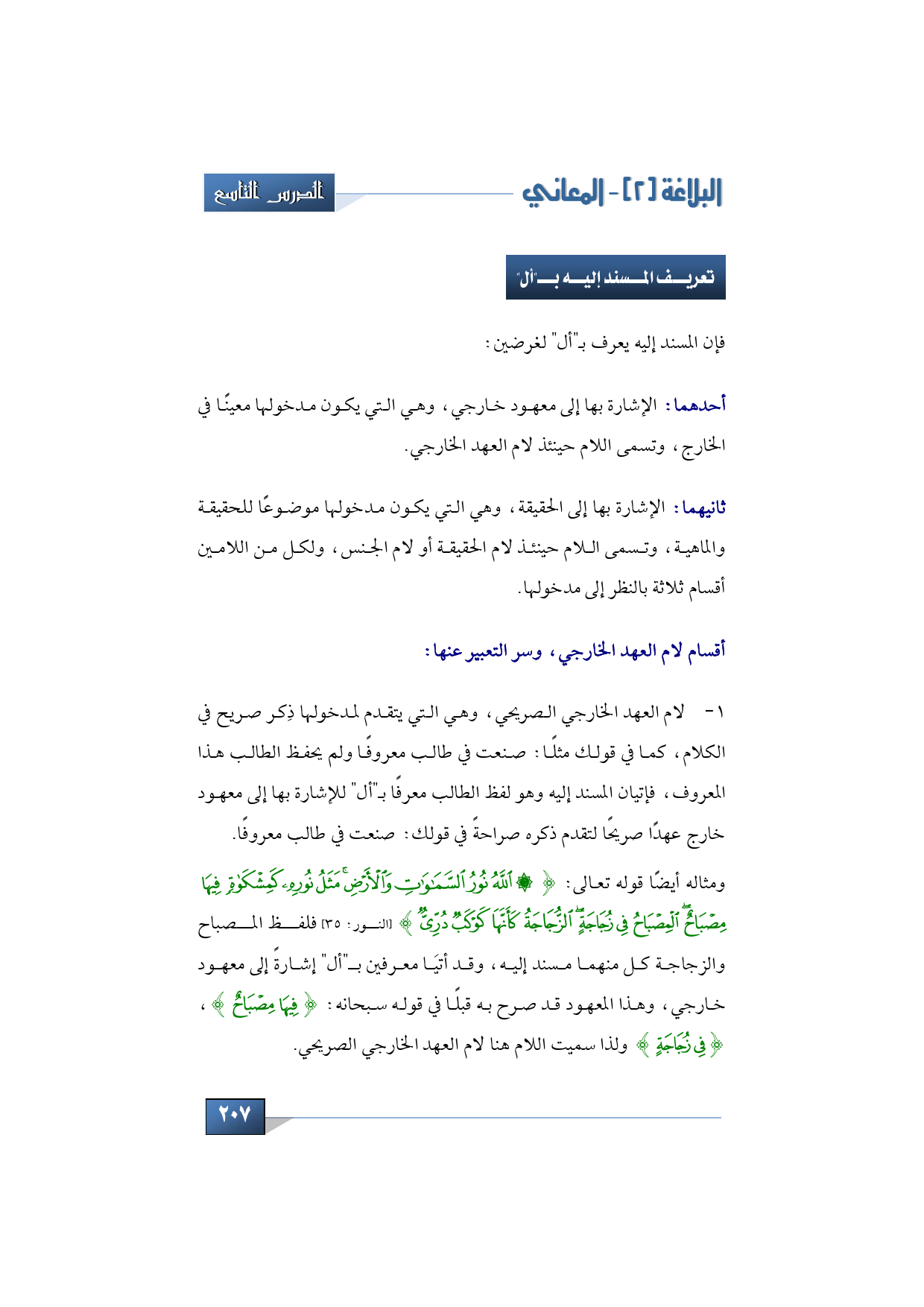 1 - هناك لام العهد الخارجي الصريحي، وهي التي يتقدم لمدخولها ذِكر صريح في الكلام، كما في قولك مثلًا: صنعت في طالب معروفًا ولم يحفظ الطالب هذا المعروف، فإتيان المسند إليه وهو لفظ الطالب معرفًا بـ"أل " للإشارة بها إلى معهود خارج عهدًا صريحًا لتقدم ذكره صراحةً في قولك: صنعت في طالب معروفًا، ومثاله أيضًا قوله تعالى: {اللَّهُ نُورُ السَّمَاوَاتِ وَالْأَرْضِ مَثَلُ نُورِهِ كَمِشْكَاةٍ فِيهَا مِصْبَاحٌ الْمِصْبَاحُ فِي زُجَاجَةٍ الزُّجَاجَةُ كَأَنَّهَا كَوْكَبٌ دُرِّيٌّ} (النور: 35) فلفظ المصباح والزجاجة كل منهما مسند إليه، وقد أتيَا معرفين بـ"أل " إشارةً إلى معهود خارجي، وهذا المعهود قد صرح به قبلًا في قوله سبحانه: {فِيهَا مِصْبَاحٌ}، {فِي زُجَاجَةٍ} ولذا سميت اللام هنا لام العهد الخارجي الصريحي.