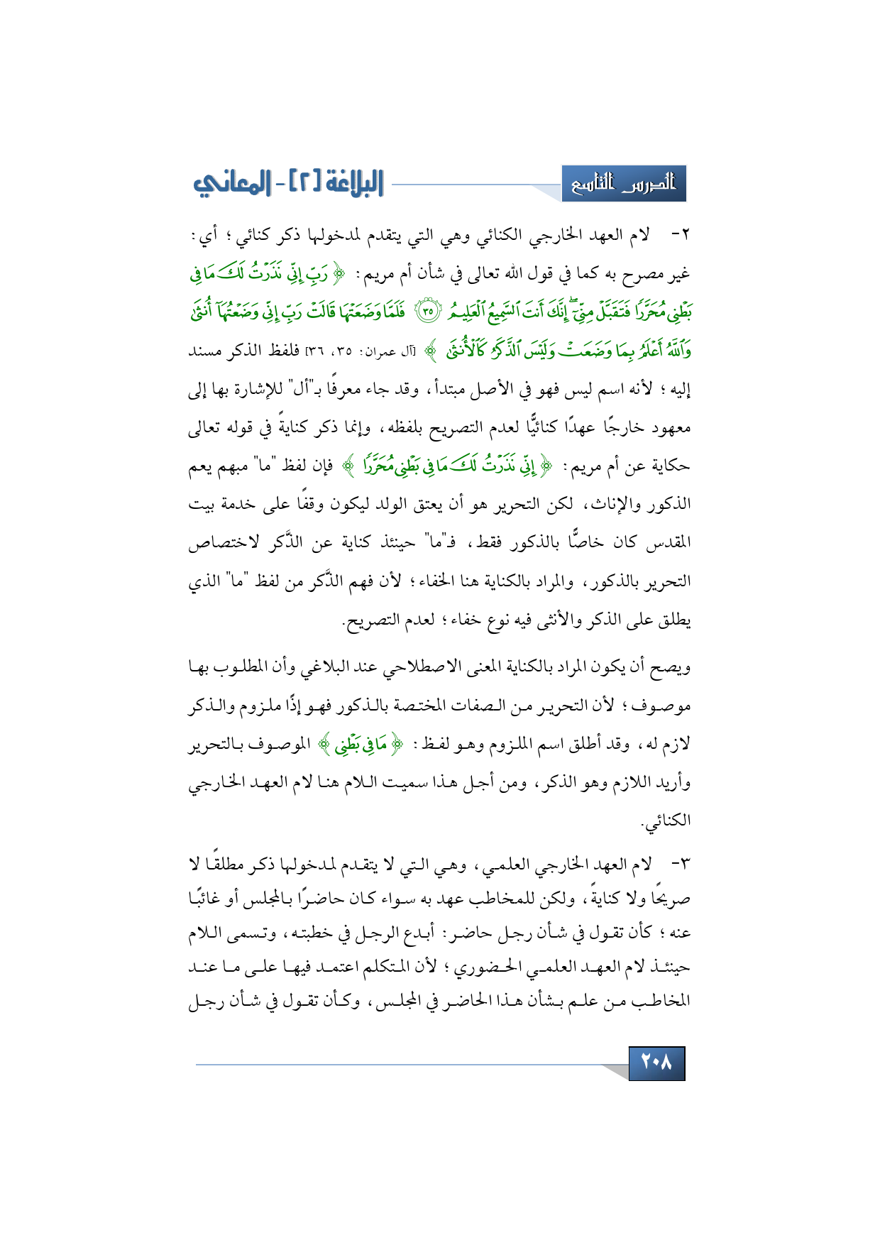 2 - وهناك لام العهد الخارجي الكنائي وهي التي يتقدم لمدخولها ذكر كنائي؛ أي: غير مصرح به كما في قول الله تعالى في شأن أم مريم: {رَبِّ إِنِّي نَذَرْتُ لَكَ مَا فِي بَطْنِي مُحَرَّرًا فَتَقَبَّلْ مِنِّي إِنَّكَ أَنْتَ السَّمِيعُ الْعَلِيمُ * فَلَمَّا وَضَعَتْهَا قَالَتْ رَبِّ إِنِّي وَضَعْتُهَا أُنْثَى وَاللَّهُ أَعْلَمُ بِمَا وَضَعَتْ وَلَيْسَ الذَّكَرُ كَالْأُنْثَى} (آل عمران: 35، 36) فلفظ الذكر مسند إليه؛ لأنه اسم ليس فهو في الأصل مبتدأ، وقد جاء معرفًا بـ"أل " للإشارة بها إلى معهود خارجًا عهدًا كنائيًّا لعدم التصريح بلفظه، وإنما ذكر كنايةً في قوله تعالى حكاية عن أم مريم: {نَذَرْتُ لَكَ مَا فِي بَطْنِي مُحَرَّرًا} فإن لفظ ما مبهم يعم الذكور والإناث، لكن التحرير وهو أن يعتق الولد ليكون وقفًا على خدمة بيت المقدس كان خاصًّا بالذكور فقط، فـ"ما" حينئذ كناية عن الذكر لاختصاص التحرير بالذكور، والمراد بالكناية هنا الخفاء؛ لأن فهم الذكر من لفظ "ما" الذي يطلق على الذكر والأنثى فيه نوع خفاء؛ لعدم التصريح.