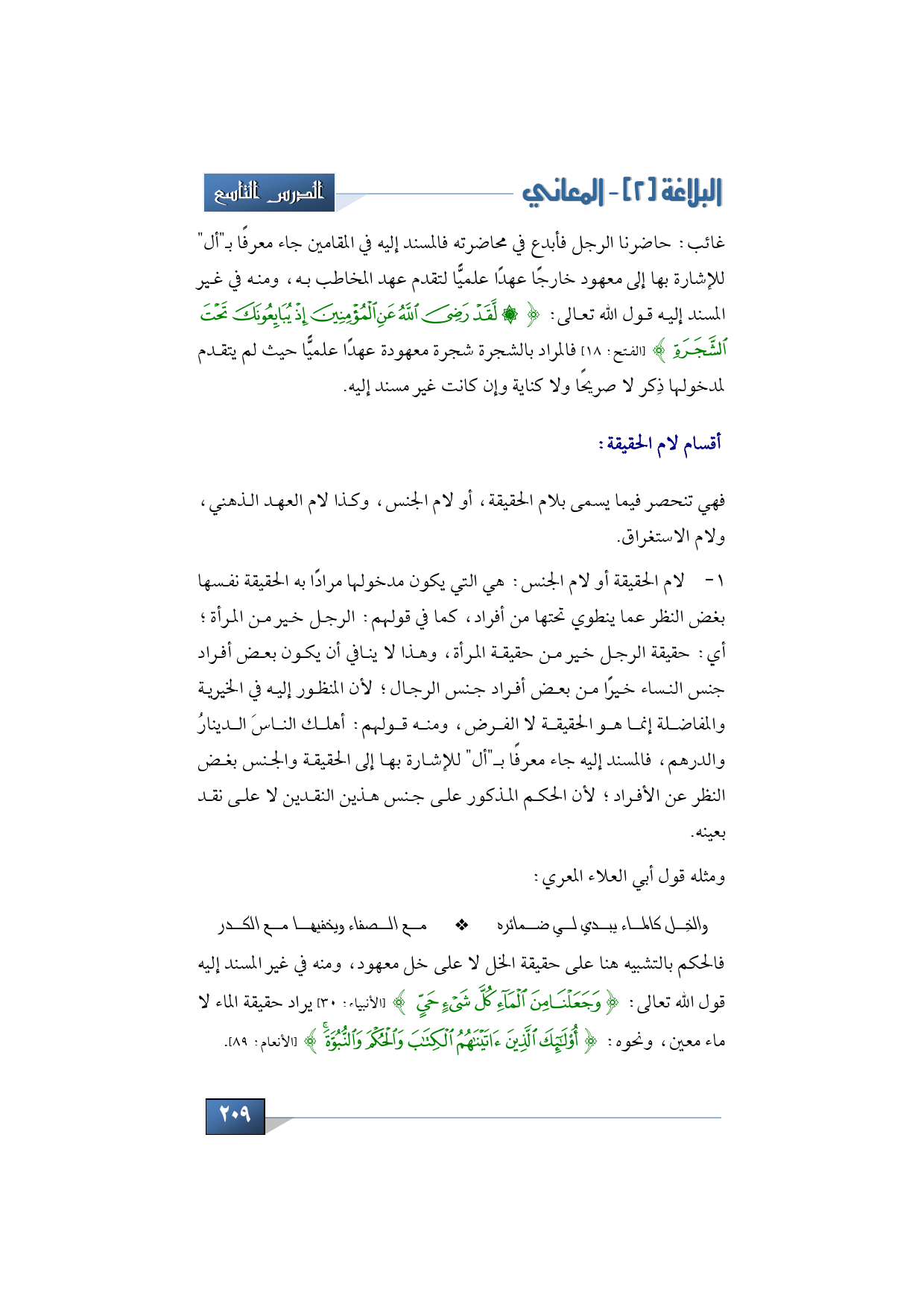 غائب: حاضرنا الرجل فأبدع في محاضرته فالمسند إليه في المقامين جاء معرفًا ب ـ"أل " للإشارة بها إلى معهود خارجًا عهدًا علميًّا لتقدم عهد المخاطب به، ومنه في غير المسند إليه قول الله تعالى: {لَقَدْ رَضِيَ اللَّهُ عَنِ الْمُؤْمِنِينَ إِذْ يُبَايِعُونَكَ تَحْتَ الشَّجَرَةِ} (الفتح: 18) فالمراد بالشجرة شجرة معهودة عهدًا علميًّا حيث لم يتقدم لمدخولها ذِكر لا صريحًا ولا كناية وإن كانت غير مسند إليه.
