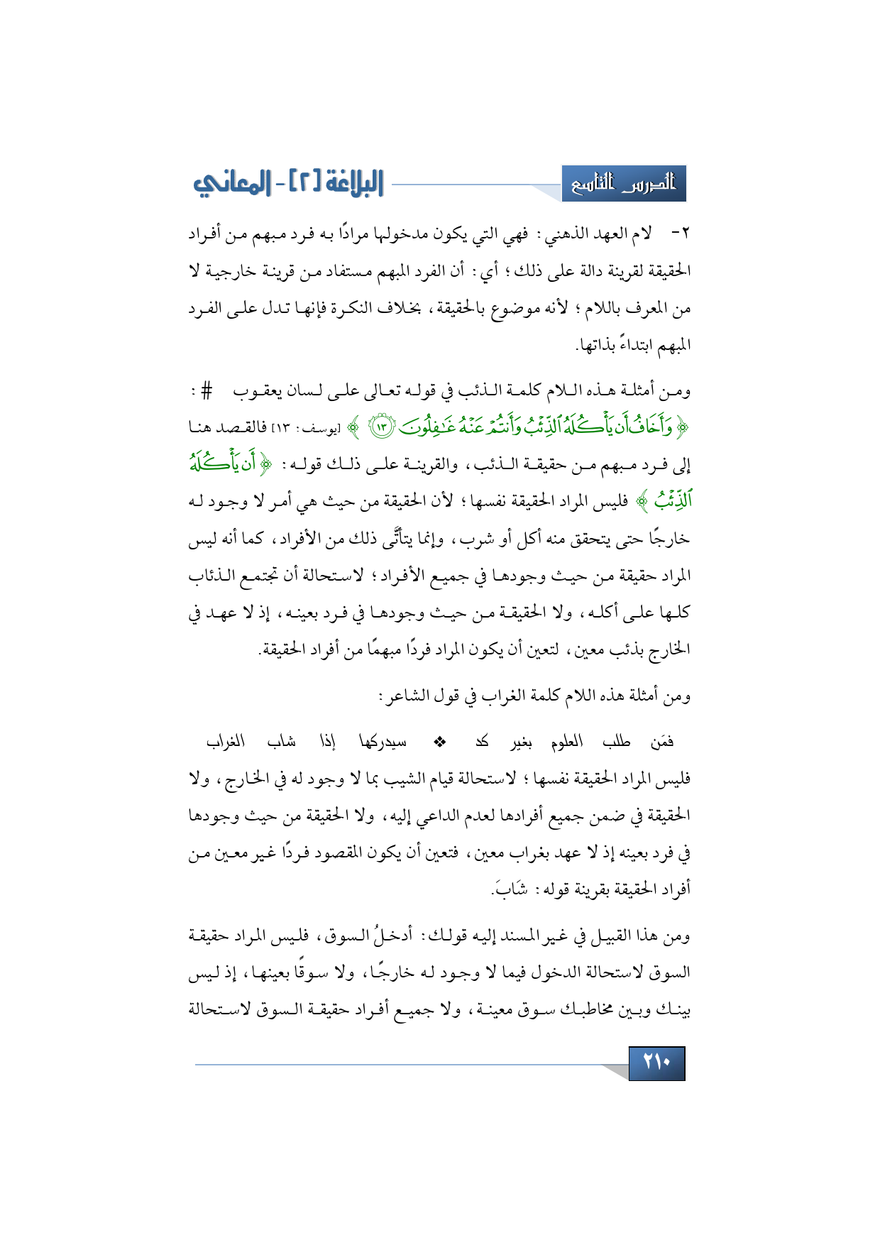 ومن أمثلة هذه اللام كلمة الذئب في قوله تعالى على لسان يعقوب - عليه السلام-: {وَأَخَافُ أَنْ يَأْكُلَهُ الذِّئْبُ وَأَنْتُمْ عَنْهُ غَافِلُونَ} (يوسف: 13) فالقصد هنا إلى فرد مبهم من حقيقة الذئب، والقرينة على ذلك قوله: {أَنْ يَأْكُلَهُ الذِّئْبُ} فليس المراد الحقيقة نفسها؛ لأن الحقيقة من حيث هي أمر لا وجود له خارجًا حتى يتحقق منه أكل أو شرب، وإنما يتأتَّى ذلك من الأفراد، كما أنه ليس المراد حقيقة من حيث وجودها في جميع الأفراد؛ لاستحالة أن تجتمع الذئاب كلها على أكله، ولا الحقيقة من حيث وجودها في فرد بعينه، إذ لا عهد في الخارج بذئب معين، لتعين أن يكون المراد فردًا مبهمًا من أفراد الحقيقة.
