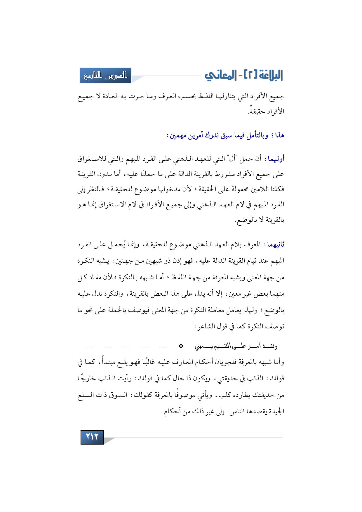 أولهما: أن حمل "أل " التي للعهد الذهني على الفرد المبهم والتي للاستغراق على جميع الأفراد مشروط بالقرينة الدالة على ما حملتَا عليه، أما بدون القرينة فكلتا اللامين محمولة على الحقيقة؛ لأن مدخولها موضوع للحقيقة؛ فإذن فالنظر إلى الفرد المبهم في لام العهد الذهني وإلى جميع الأفراد في لام الاستغراق إنما هو بالقرينة لا بالوضع.