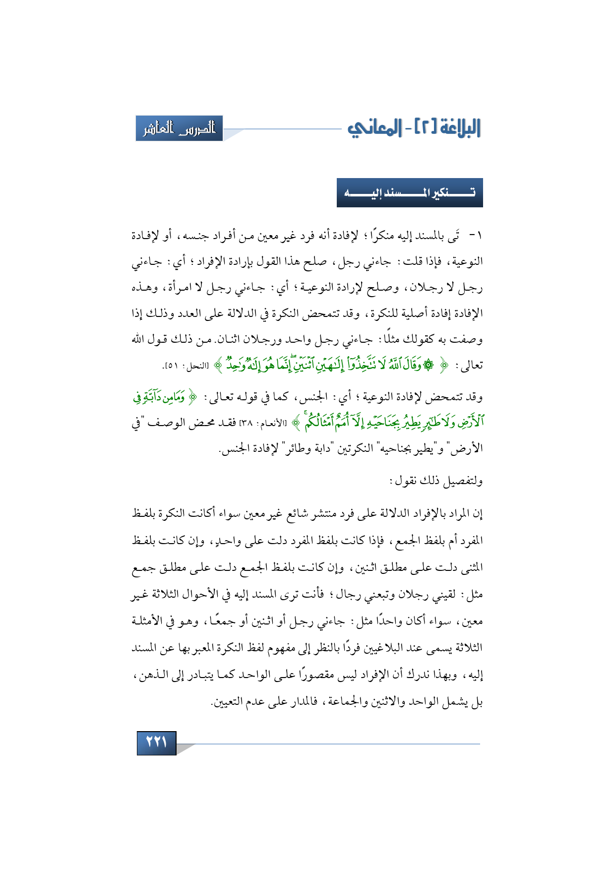يؤتَى بالمسند إليه منكرًا؛ لإفادة أنه فرد غير معين من أفراد جنسه، أو لإفادة النوعية، فإذا قلت: جاءني رجل، صلح هذا القول بإرادة الإفراد؛ أي: جاءني رجل لا رجلان، وصلح لإرادة النوعية؛ أي: جاءني رجل لا امرأة، وهذه الإفادة إفادة أصلية للنكرة، وقد تتمحض النكرة في الدلالة على العدد وذلك إذا وصفت به كقولك مثلًا: جاءني رجل واحد ورجلان اثنان. من ذلك قول الله تعالى: {وَقَالَ اللَّهُ لَا تَتَّخِذُوا إِلَهَيْنِ اثْنَيْنِ إِنَّمَا هُوَ إِلَهٌ وَاحِدٌ} (النحل: 51).