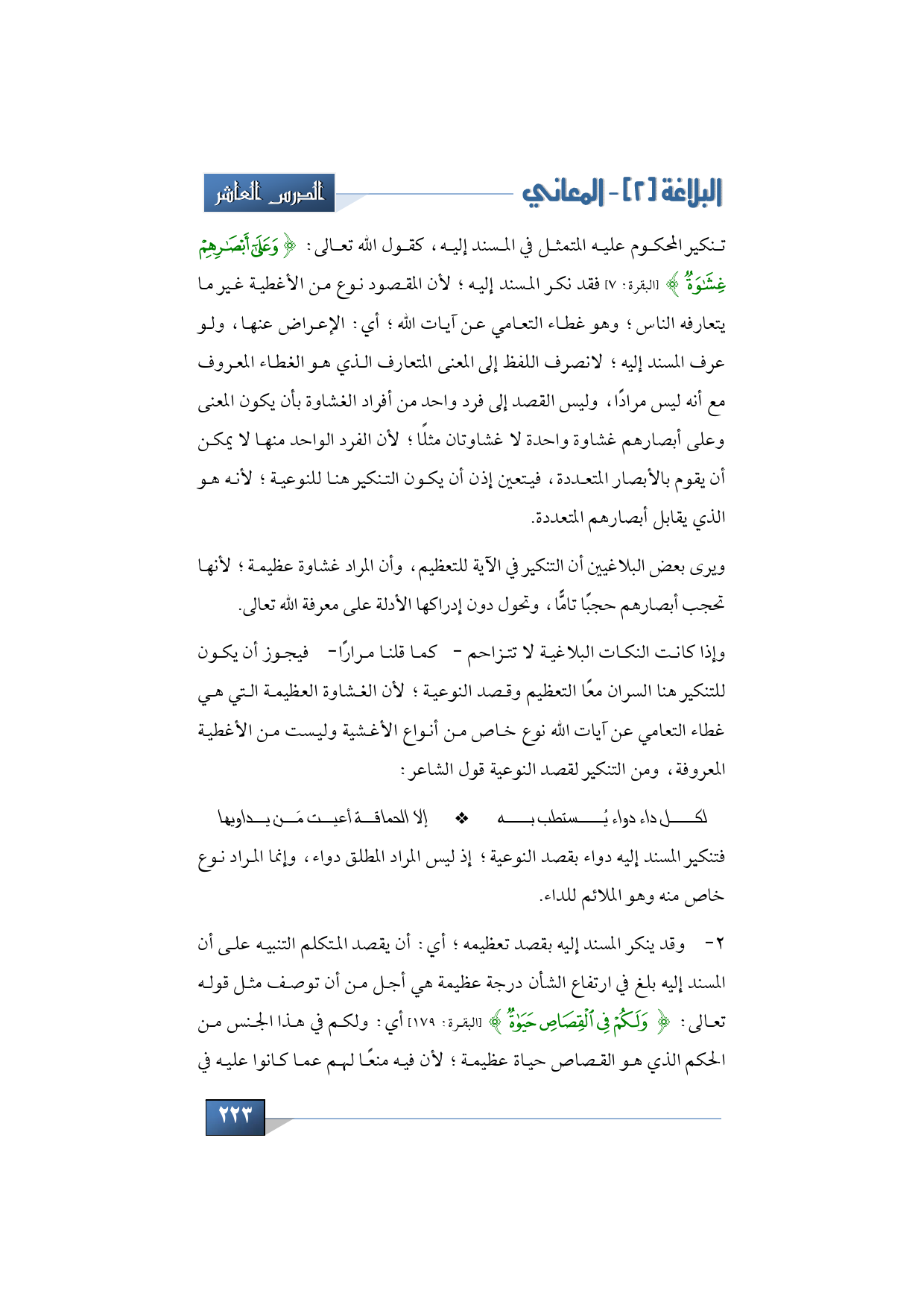 فتنكير المسند إليه دواء بقصد النوعية؛ إذ ليس المراد المطلق دواء، وإنما المراد نوع خاص منه وهو الملائم للداء، وقد ينكر المسند إليه ب قصد تعظيمه؛ أي: أن يقصد المتكلم التنبيه على أن المسند إليه بلغ في ارتفاع الشأن درجة عظيمة هي أجل من أن توصف مثل قوله تعالى: {وَلَكُمْ فِي الْقِصَاصِ حَيَاةٌ} (البقرة: 179) أي: ولكم في هذا الجنس من الحكم الذي هو القصاص حياة عظيمة؛ لأن فيه منعًا لهم عما كانوا عليه في
