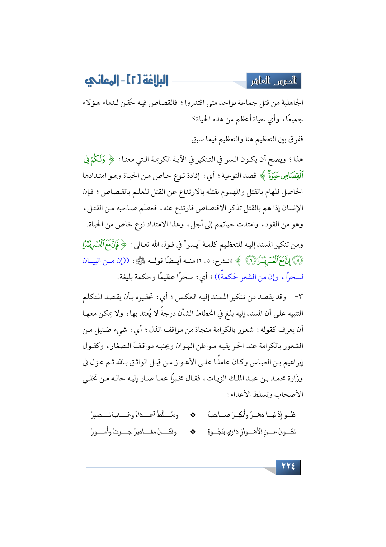 ومن تنكير المسند إليه ل لتعظيم كلمة يسر في قول الله تعالى: {فَإِنَّ مَعَ الْعُسْرِ يُسْرًا * إِنَّ مَعَ الْعُسْرِ يُسْرًا} (الشرح: 5، 6) منه أيضًا قوله - صلى الله عليه وسلم-: ((إن من البيان لسحرًا، وإن من الشعر لحكمة ً))؛ أي: سحرًا عظيم ًا وحكمة بليغة.