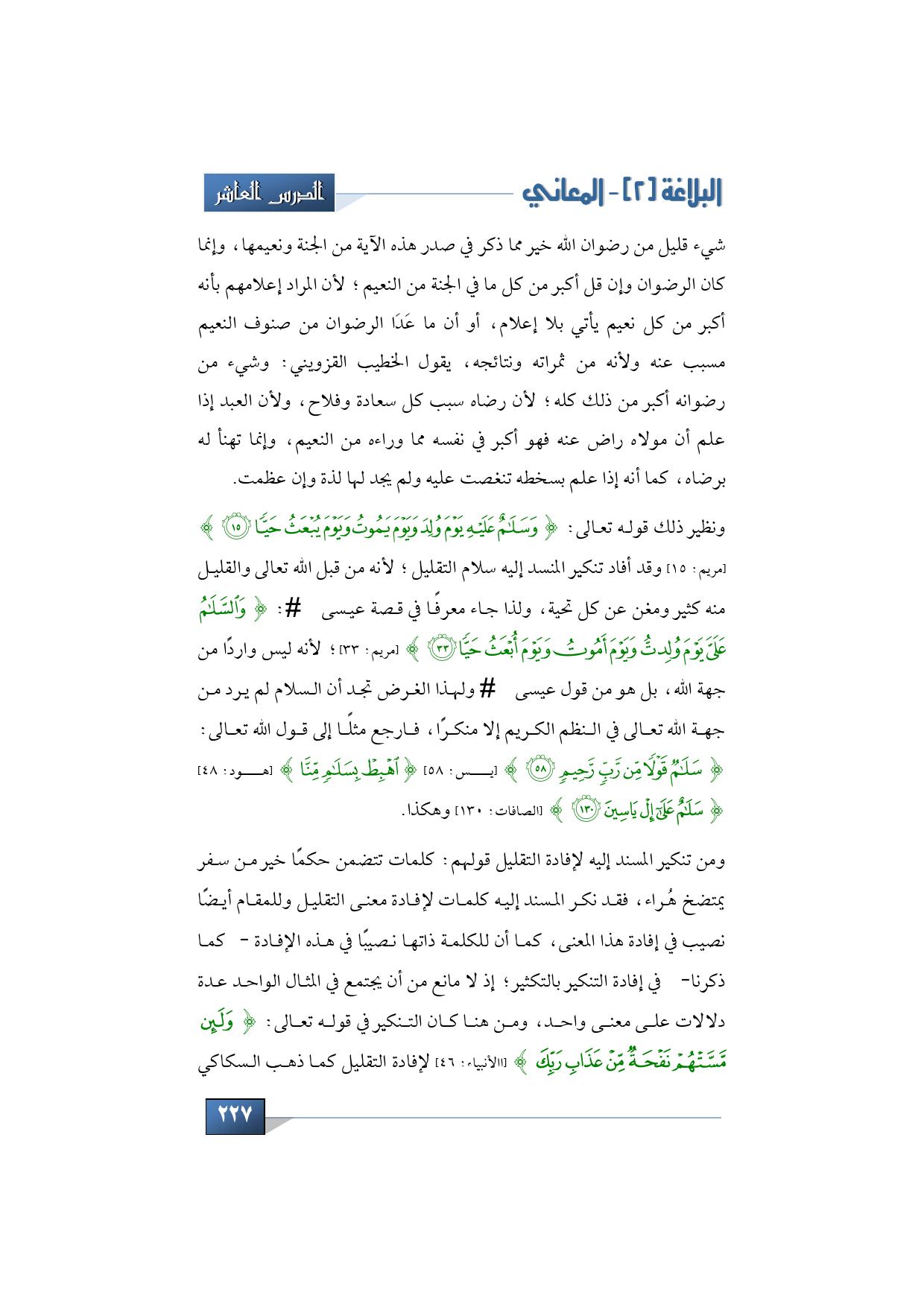 ونظير ذلك قوله تعالى: {وَسَلَامٌ عَلَيْهِ يَوْمَ وُلِدَ وَيَوْمَ يَمُوتُ وَيَوْمَ يُبْعَثُ حَيًّا} (مريم: 15) وقد أفاد تنكير المنسد إليه سلام التقليل؛ لأنه من قبل الله تعالى والقليل منه كثير ومغن عن كل تحية، ولذا جاء معرفًا في قصة عيسى - عليه السلام-: {وَالسَّلَامُ عَلَيَّ يَوْمَ وُلِدْتُ وَيَوْمَ أَمُوتُ وَيَوْمَ أُبْعَثُ حَيًّا} (مريم: 33)؛ لأنه ليس واردًا من جهة الله، بل هو من قول عيسى - عليه السلام- ولهذا الغرض تجد أن السلام لم يرد من جهة الله تعالى في النظم الكريم إلا منكرًا، فارجع مثلًا إلى قول الله تعالى: {سَلَامٌ قَوْلًا مِنْ رَبٍّ رَحِيمٍ} (يس: 58) {اهْبِطْ بِسَلَامٍ مِنَّا} (هود: 48) {سَلَامٌ عَلَى إِلْ يَاسِينَ} (الصافات: 130) وهكذا.